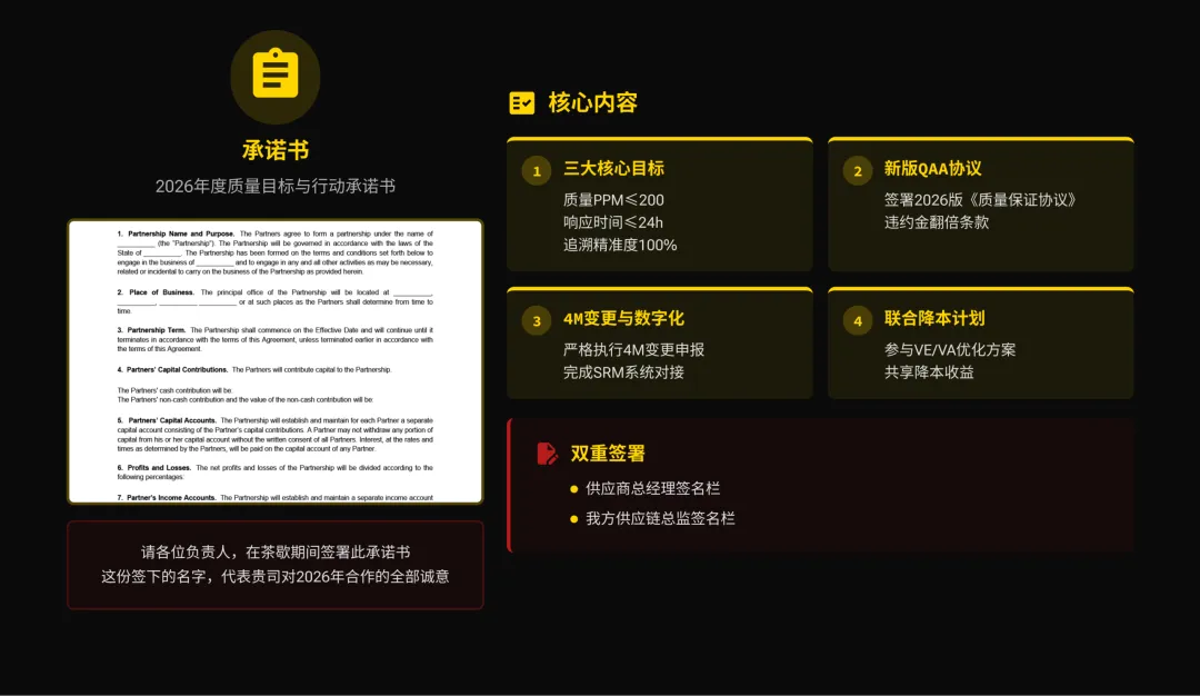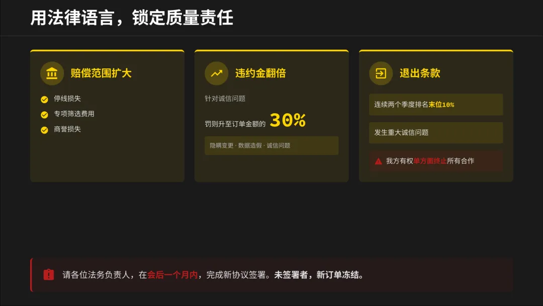 除了门槛,还有清晰的“军令状”:PPM降60%、24小时响应、100%精准追溯。以及更严厉的法律语言:赔偿范围扩大、违约金翻倍、针对诚信问题可单方面终止合作。这意味着,质量责任已经从“合作条款”升级为具有强力约束的“法律契约”。