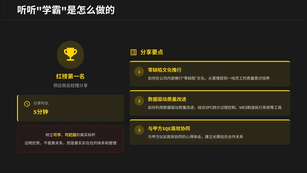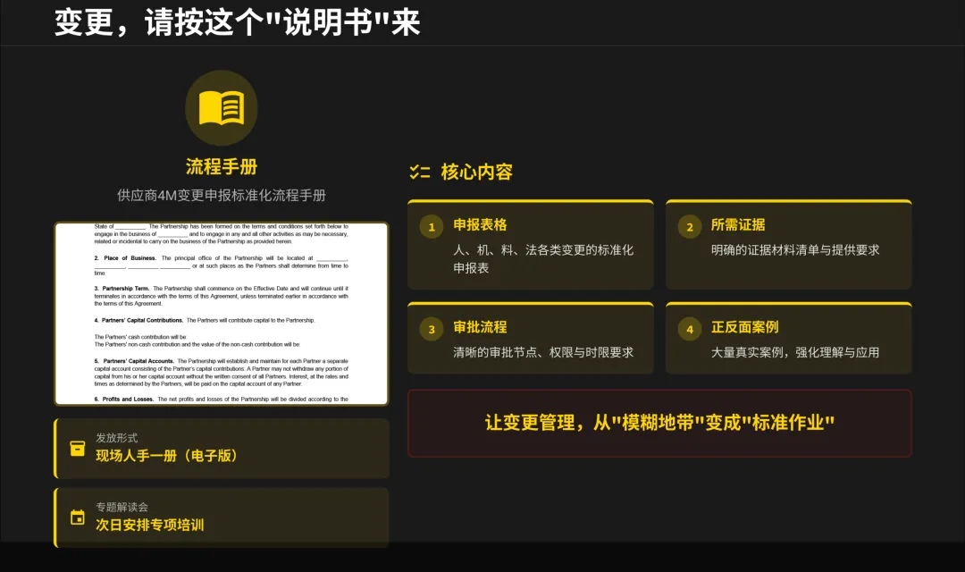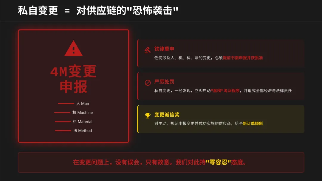 大会将“私自变更”定义为对供应链的“恐怖袭击”。同时,也设立了“变更诚信奖”。这传递的信号是:我们不拒绝变更,但拒绝不透明、不守规的变更。主动、规范地申报4M变更,会成为你赢得信任和新订单的重要筹码。