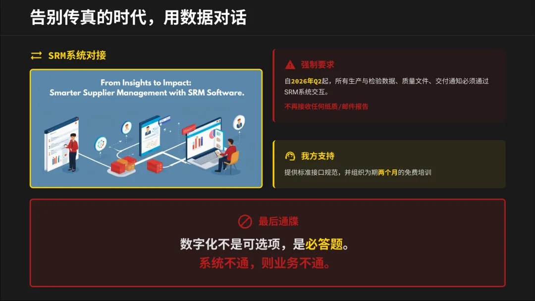 “告别传真时代”不是口号。自2026年Q2起,所有数据必须通过SRM系统交互。这强迫我们双方的过程透明化、数据实时化。对你而言,这不仅是接个接口,更是倒逼内部生产、检验、管理流程的数字化转型。早完成,早主动。