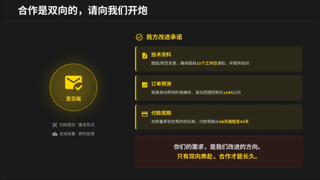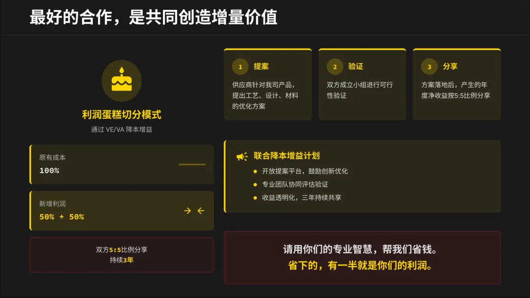 大会最诱人的部分之一,是“联合降本增益计划”。甲方开放提案平台,双方按5:5比例分享降本收益,持续三年。这意味着,你的技术智慧和工艺创新,可以直接转化为利润。合作的本质从“压价”变成了“一起做大蛋糕并公平分蛋糕”。