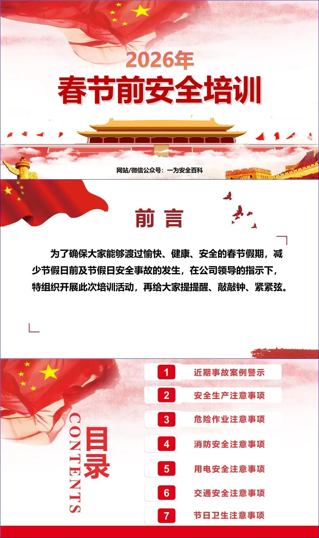 该文档是《2026年度春节前安全培训(含近期事故案例)》的PPT讲义,旨在通过节前安全教育,提升员工安全意识,防范春节期间及节前高发的安全事故。全文结构清晰,共分为七个主要部分:
