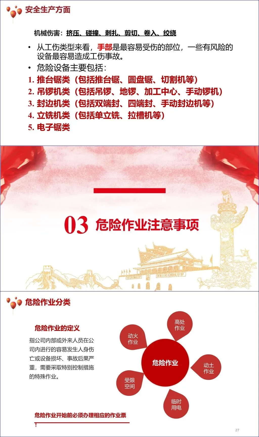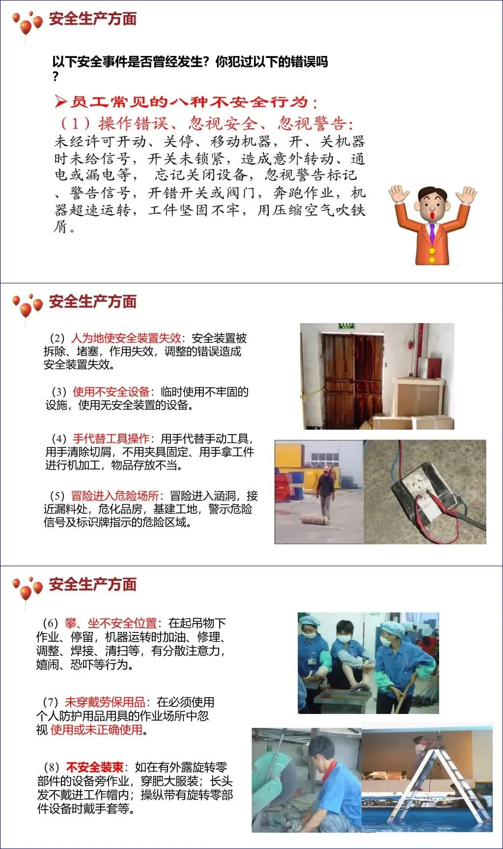 强调“事故由人诱发”,列举常见不安全行为:如绕过安全装置、用手代替工具、冒险进入危险区、未穿戴劳保用品、攀坐不安全位置、着装不当等。