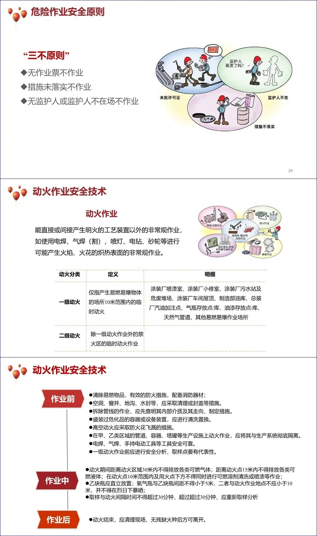 动火作业:分级管理,清理可燃物,气体检测,防火花飞溅,气瓶间距合规。