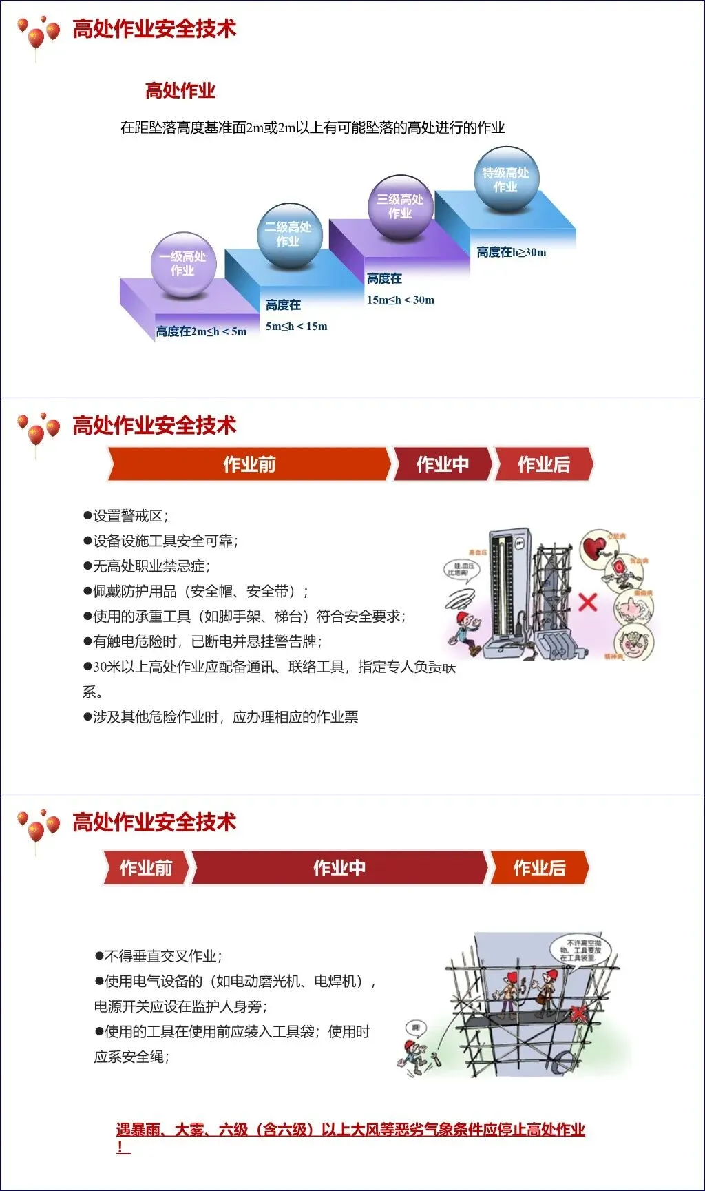 高处作业:按高度分级,禁酒后/带病作业,佩戴安全带(高挂低用),设警戒区,恶劣天气停工。