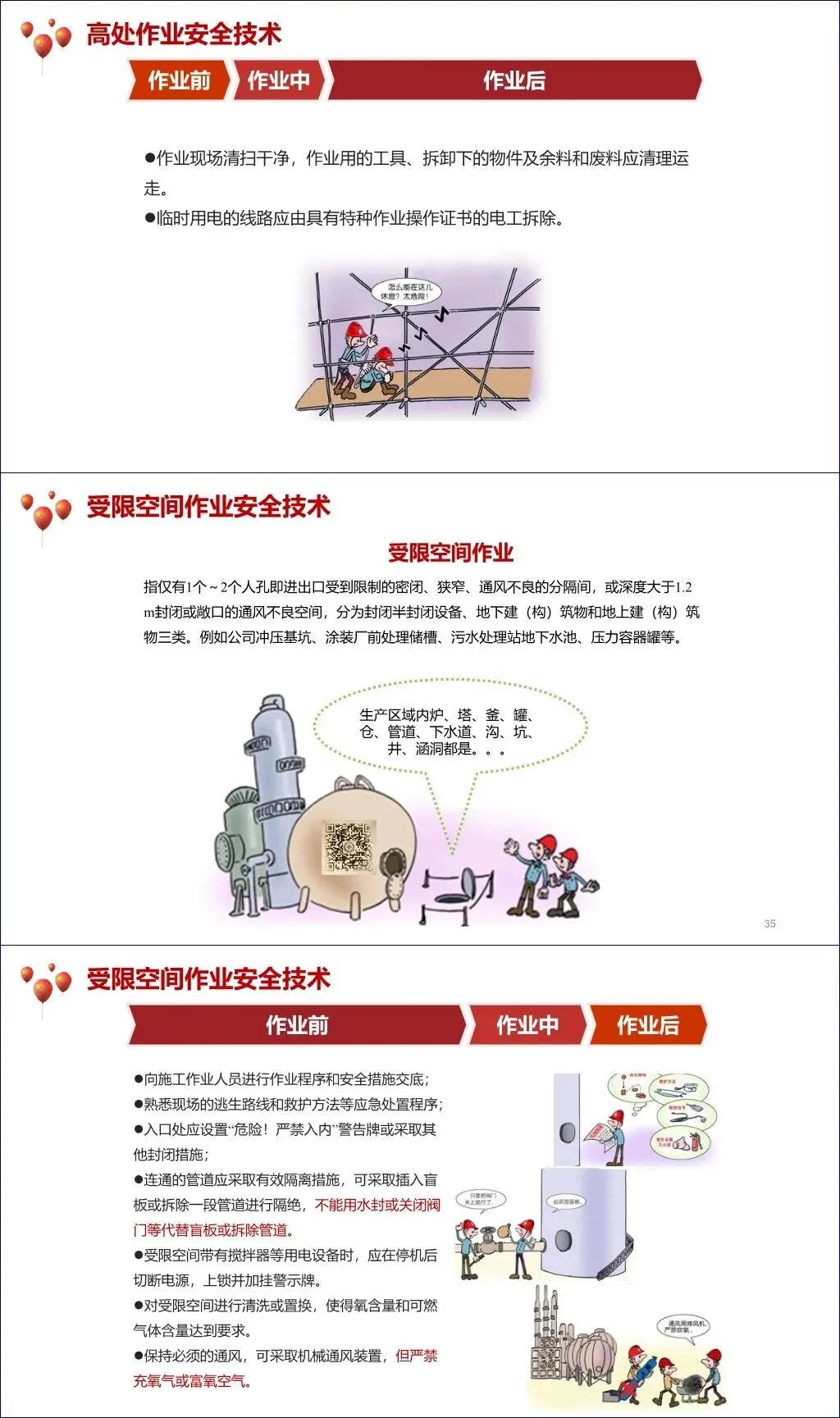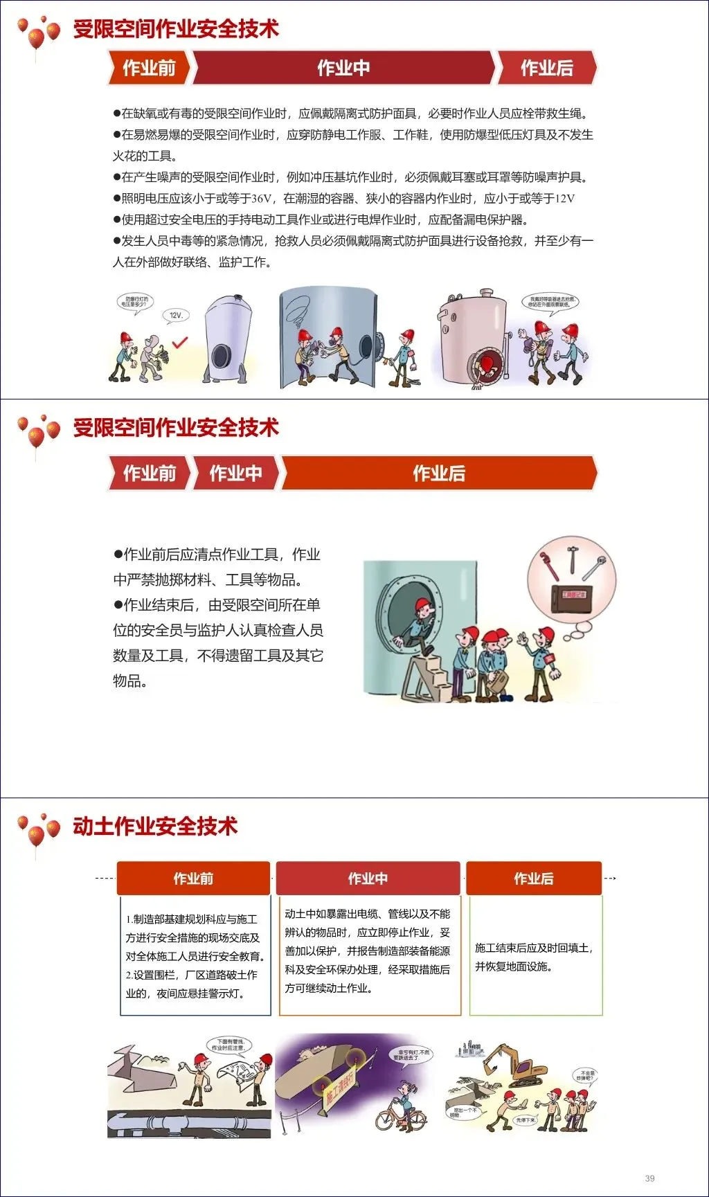 受限空间:强制通风、气体检测、隔离能源、使用防爆工具、外部监护、应急救援准备。