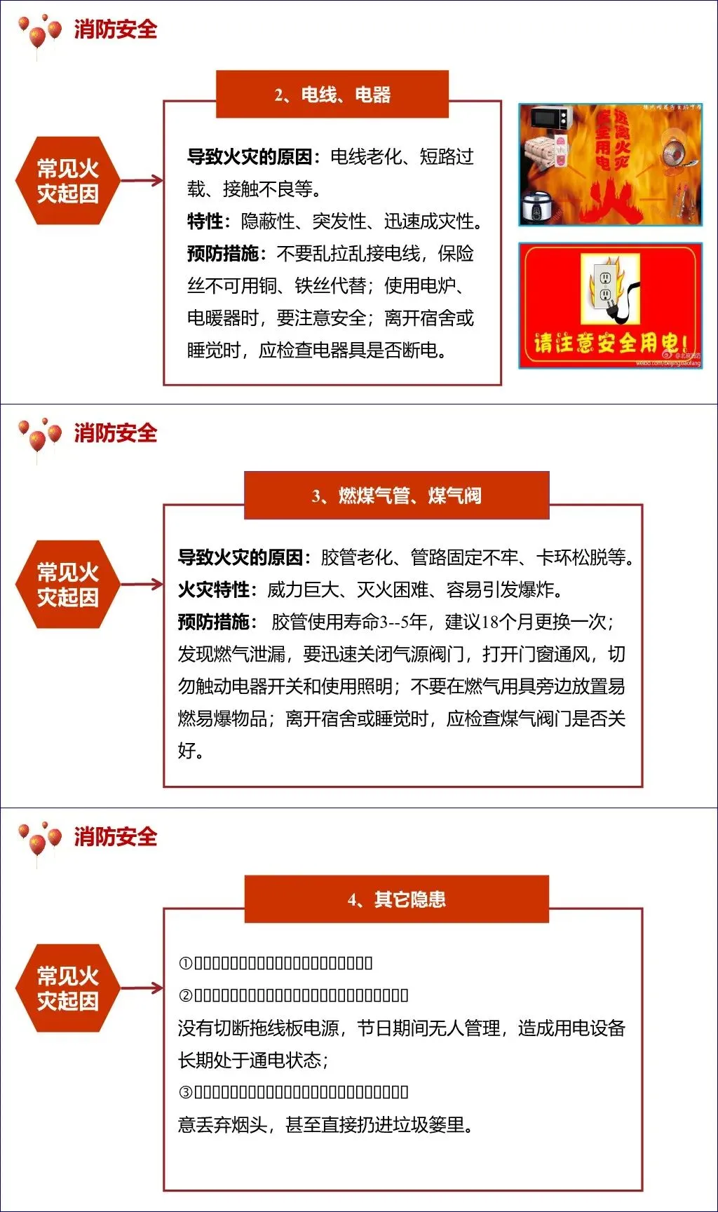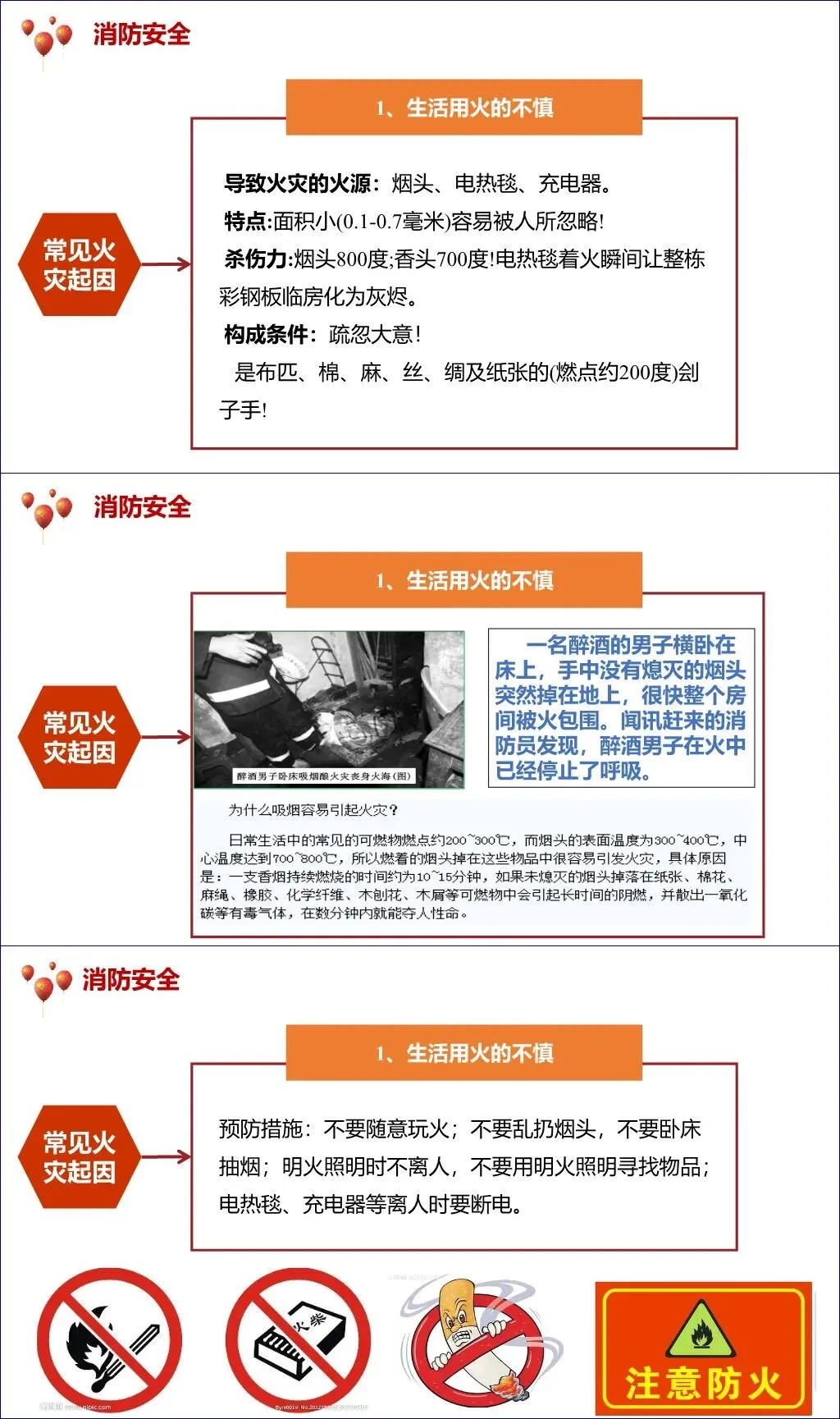 常见起火原因:烟头、电热毯、电线老化、燃气泄漏、节日期间管理松懈。