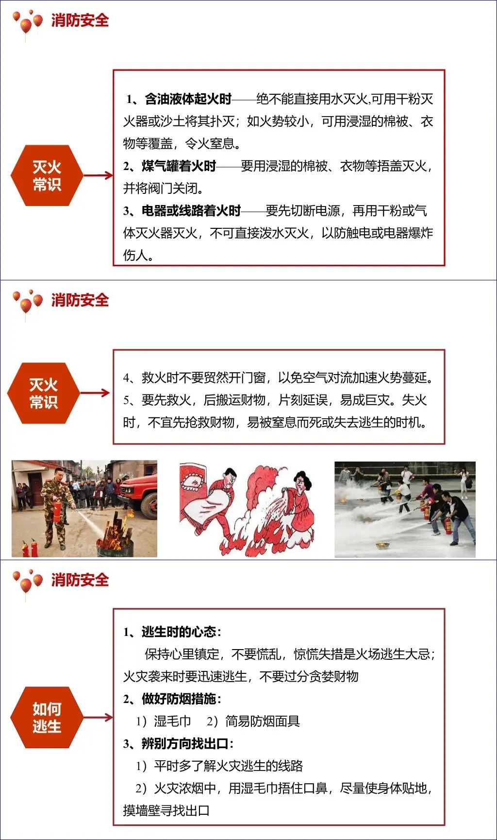 灭火常识:油火用干粉/沙土;煤气罐先关阀再覆盖;电器火灾先断电。