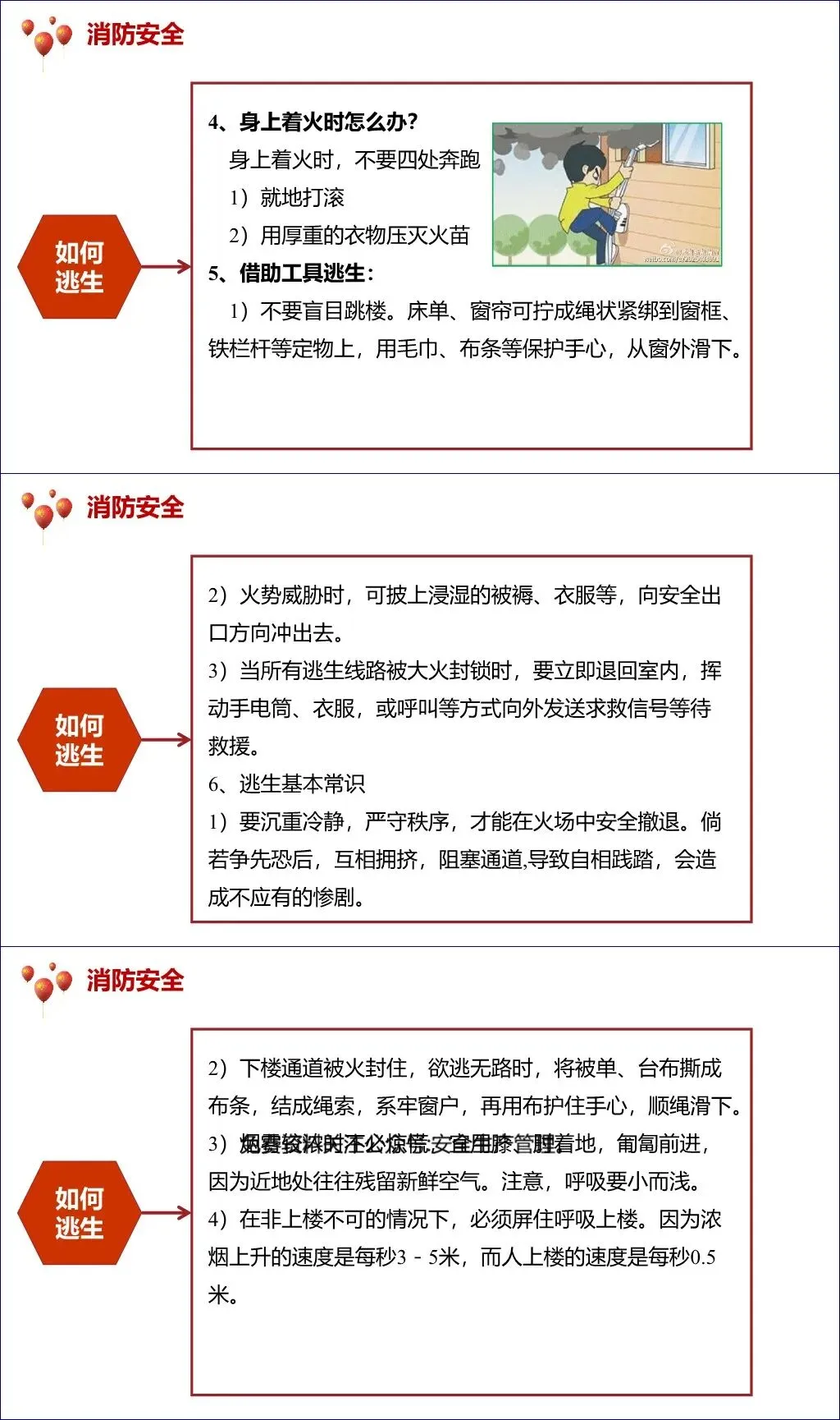 逃生要点:保持冷静、防烟(湿毛巾/匍匐)、不贪财物、不盲目跳楼、利用床单结绳、被封锁时发求救信号。