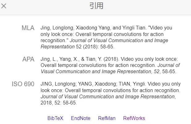 然后点击【引用】,就会弹出三种参考文献的写法,根据需要选择其中一种,ctrl+c,即可