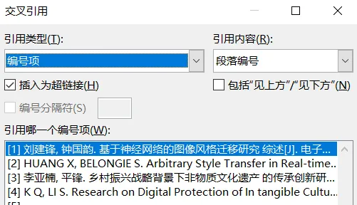 在文章中需要插入引用的地方,点击【引用】菜单下的【交叉引用】就会弹出下面的面板,选择相对应的那篇文章就可以了。