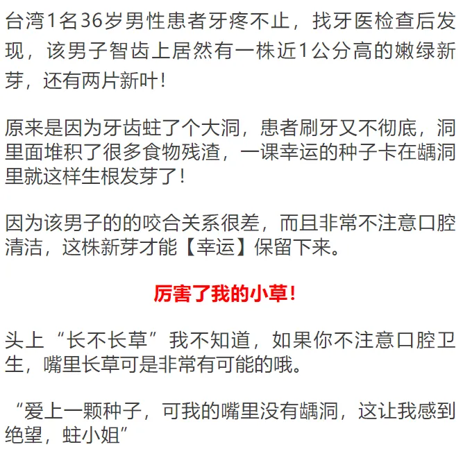 在此还是呼吁大家多多注意个人卫生,每天早晚刷牙各一次,刷牙力度要控制在1N(牛顿)的力,大约为102克,饭后漱口,使用牙线剔除食物残留。如果不注意,说不定哪天,我们的嘴里也会有一株翠绿的植物出现。
