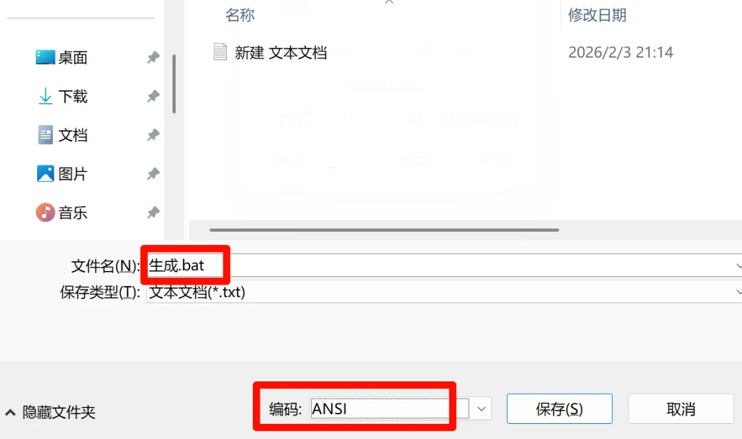 文本文档点击【文件】-【另存为】,文件名处加上后缀“.bat”,如“生成.bat”。