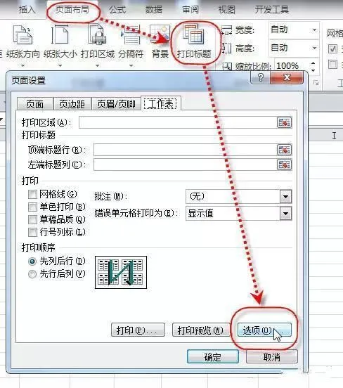 在页面布局选卡中,点击“打印标题”命令会弹出页面设置选项卡,然后点击窗口上的"选项"按钮,会弹出打印机设置的窗口。