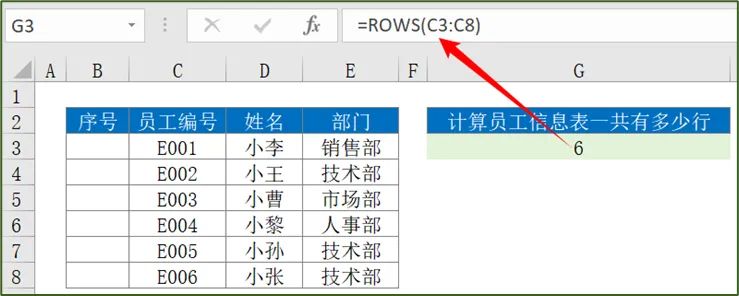 假设我们要计算员工信息表一共有多少行(不包含标题行)。函数公式:=ROWS(C3:C8)可以看出计算的结果是6行。
