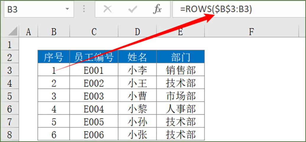 ROWS函数用的最多的场景是创建能够自动更新的序号。我们想在员工信息表最前边加一列序号,希望无论是新增或者删除行,序号列能够自动更新,不需要我们额外再花时间去手工调整。$B$3:B3是一个可动态扩展的区域;在B3单元格时,该区域是B3到B3(1行);在B4单元格时,这个区域自动变成B3到B4(2行);在B5单元格时,区域变成B3到B5(3行);依次往下……这里需要注意的是,$B$3要使用绝对引用,必须锁定初始的位置;后边的B3相对引用(这个需要随公式下拉而改变)ROWS函数就通过这样的方式,用简简单单的一个公式,实现了序号的自动排列。 以上就是今天的全部分享啦,希望这些Excel技巧能帮到有需要的你~如果大家在实际操作中遇到疑问,比如函数、快捷键、或有其他Excel操作难题,都欢迎在评论区留言告诉我~后续也会根据大家高频提问的问题,整理更多实用技巧分享给大家!