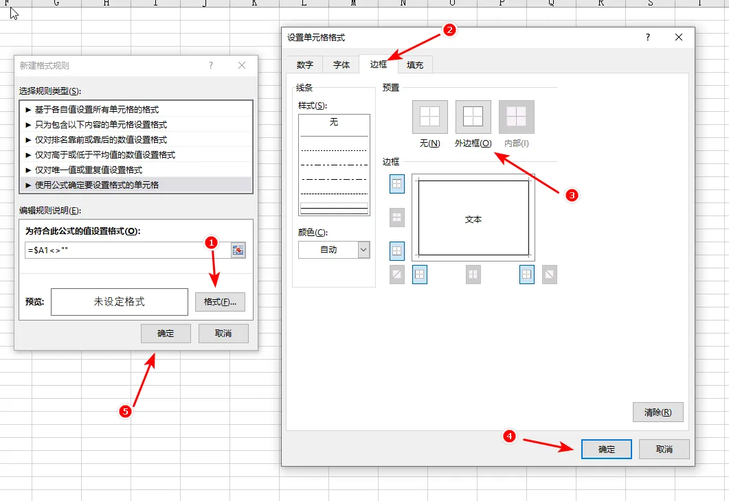 2.3.3 然后点击“外边框”,“内部”的边框不能选择,这是因为公式中参考的是A1单元格,而A1单元格是一个单元格,除非参考的是合并后居中的跨行单元格才可以选择。