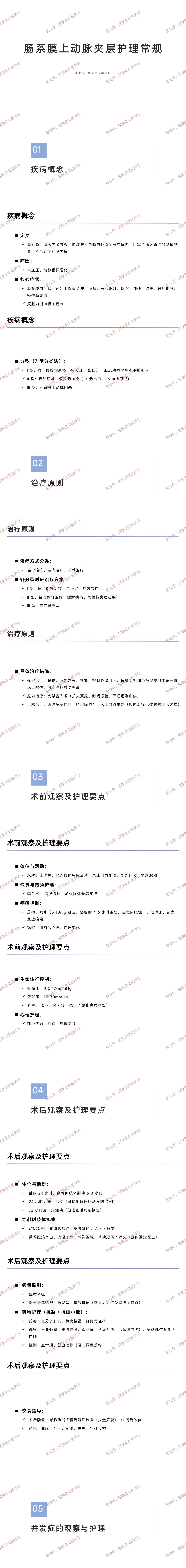 肠系膜上动脉夹层是内膜破裂后血液形成假腔致肠道缺血的疾病,核心护理逻辑为 “精准监测病情、分层护理干预、预防并发症、长期健康管理”,需配合治疗方案(保守 / 腔内 / 手术)实施全流程护理。
