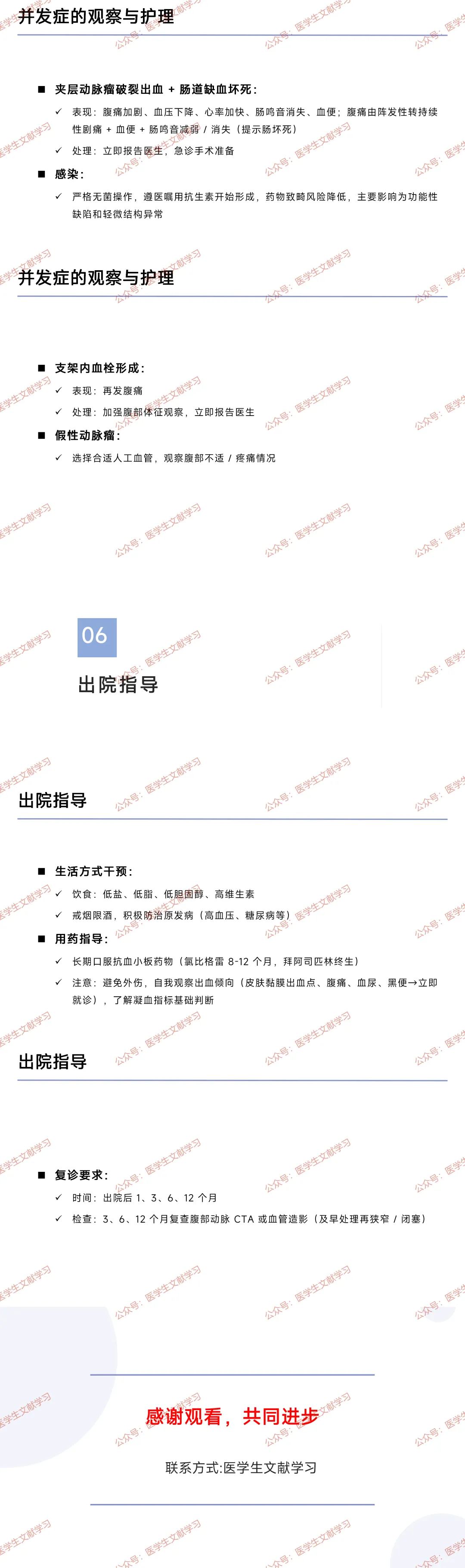 - 支架内血栓形成:表现为再发腹痛,需加强腹部体征观察,及时报告医生。
