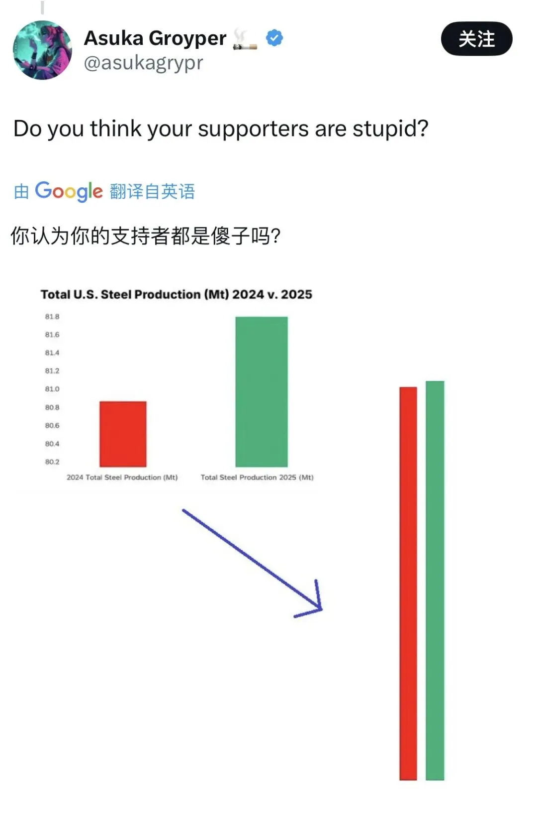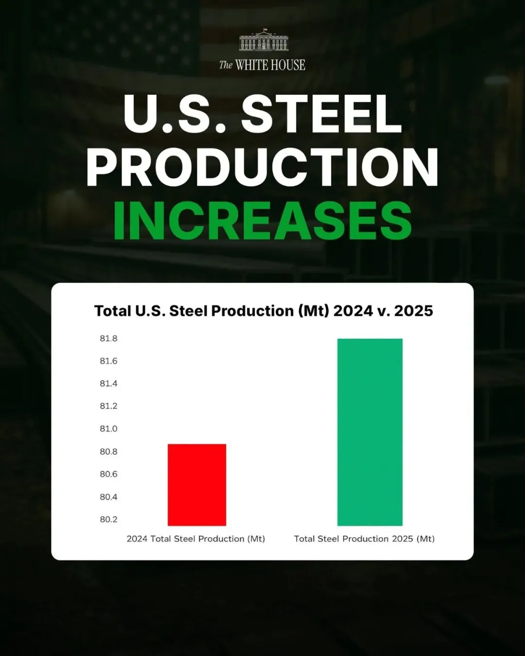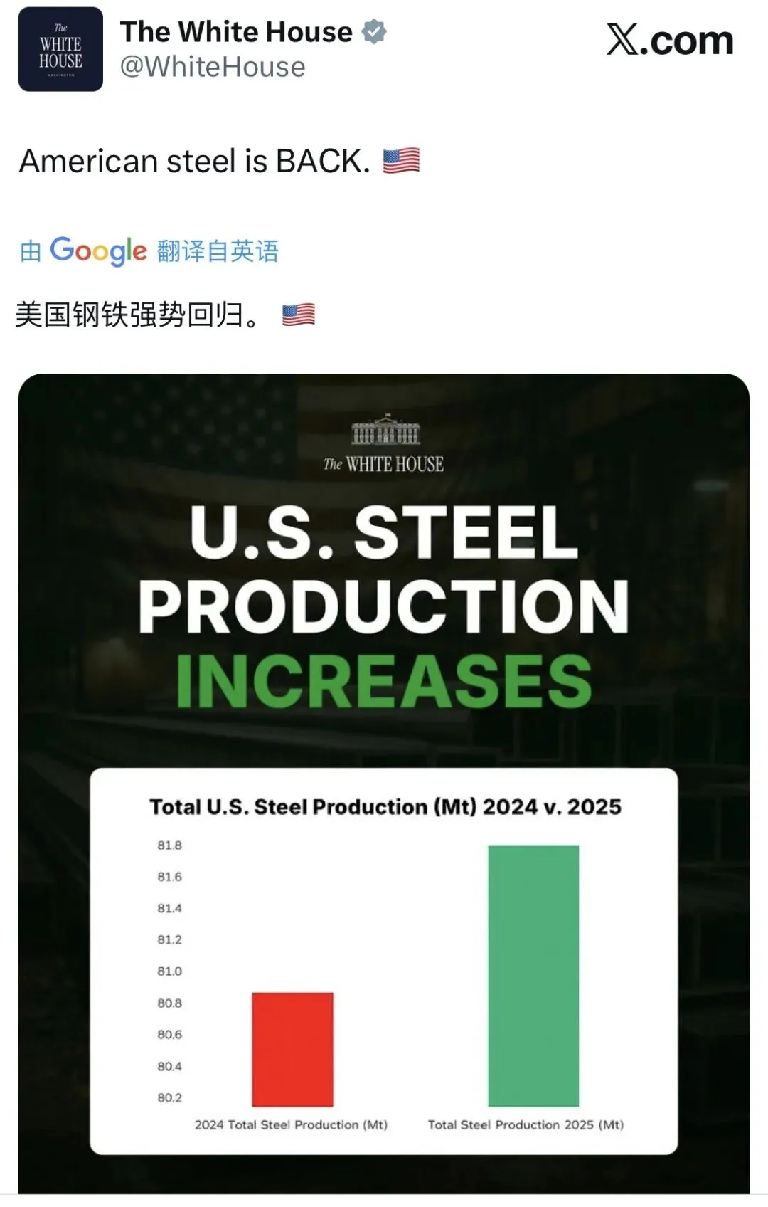 简单来说,这篇推文(主要是图)是白宫在社交平台上发布的宣传内容,核心是想表达美国钢铁产业正在强势复苏的观点。