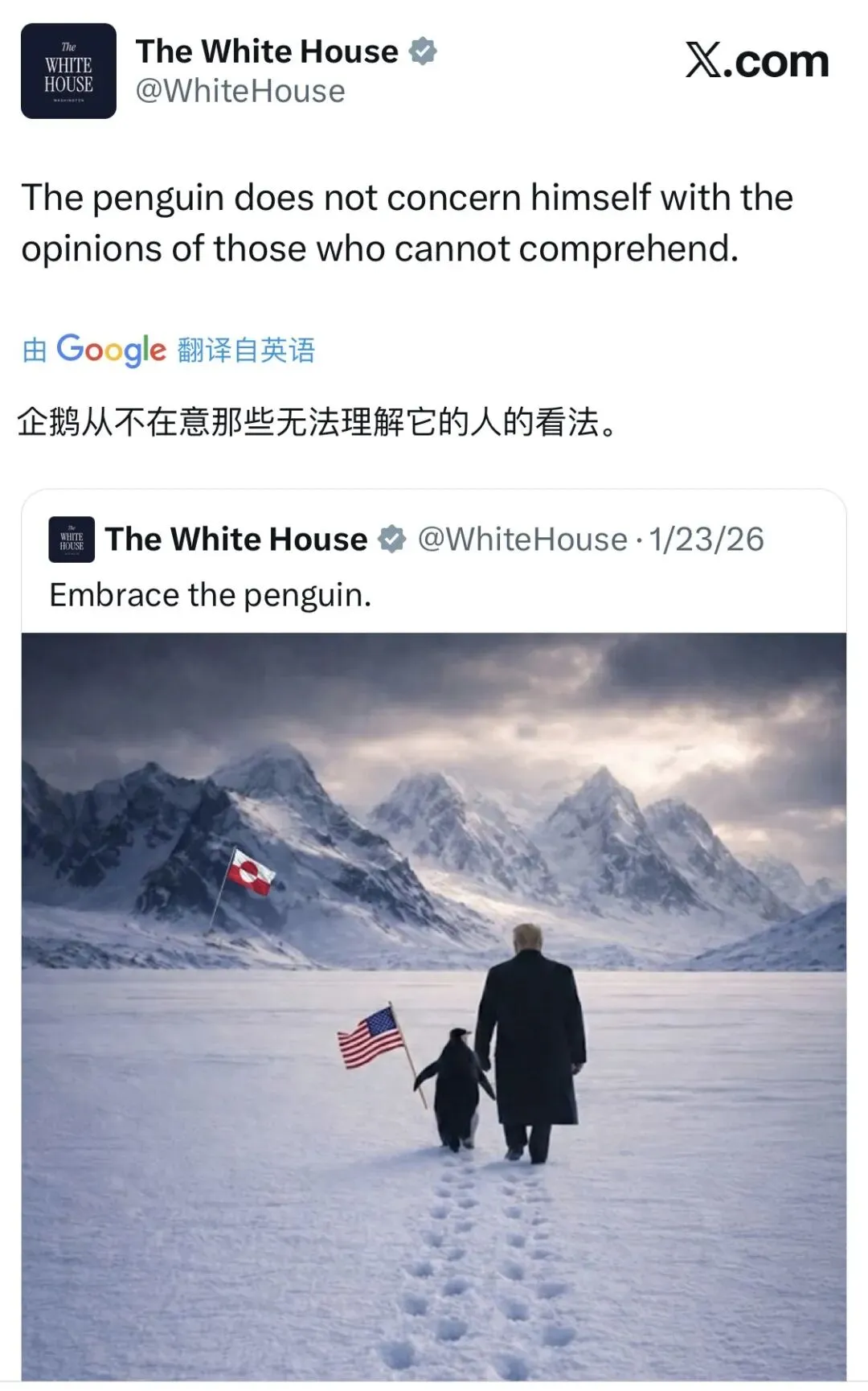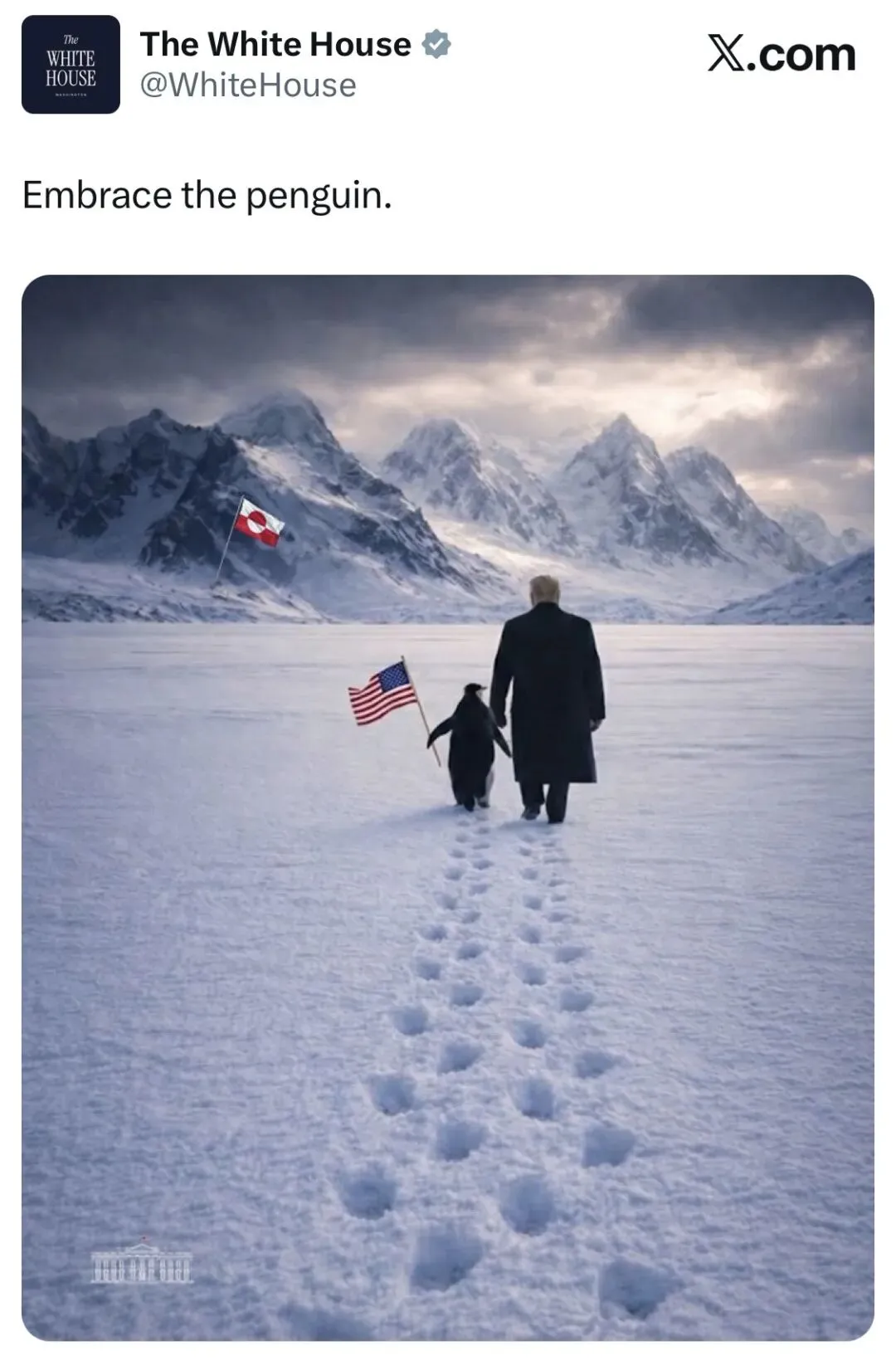 大意就是,白宫在特朗普发誓要拿下格陵兰的时候,白宫官方账号发了张照片,上面是特朗普牵着一只企鹅拿着美国国旗走在格陵兰岛上,配文是“拥抱企鹅”,大意就是想表达美国夺取了这个岛了。
