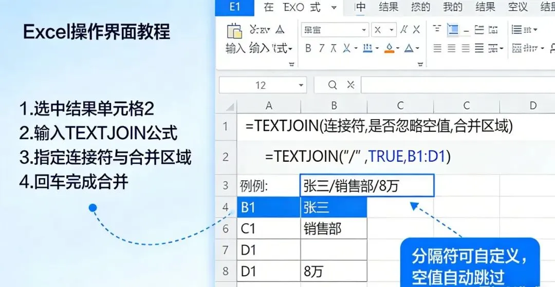 文本拆分:选中空白单元格,输入公式 =TEXTSPLIT(待拆分单元格, 分隔符),比如 =TEXTSPLIT(A1,"-"),A1 是 “张三 - 销售部 - 8 万”,按下回车,瞬间拆分为 “张三”“销售部”“8 万” 三个独立单元格;文本合并:选中结果单元格,输入公式 =TEXTJOIN(连接符, 是否忽略空值, 合并区域),比如 =TEXTJOIN("/",TRUE,B1:D1),B1:D1 是拆分后的内容,按下回车,自动合并为 “张三 / 销售部 / 8 万”,分隔符可随意换,空值自动跳过,拆分合并一步到位!