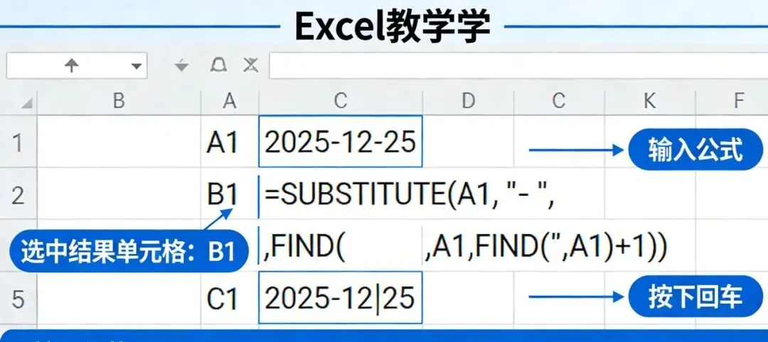 选中结果单元格,输入公式 =SUBSTITUTE(待处理文本, 要替换的字符, 新字符, FIND(第N个字符, 待处理文本)),比如 =SUBSTITUTE(A1,"-","|",FIND("-",A1,FIND("-",A1)+1)),A1 是 “2025-12-25”,按下回车,直接把第二个 “-” 换成 “|”,得到 “2025-12|25”;核心优势:FIND 函数精准定位字符位置,SUBSTITUTE 只替换指定位置,不影响其他内容,替换指定序号字符、修正格式错误都适用,精准又高效!