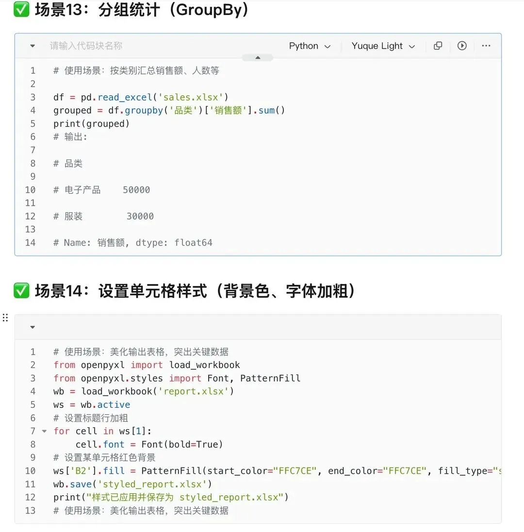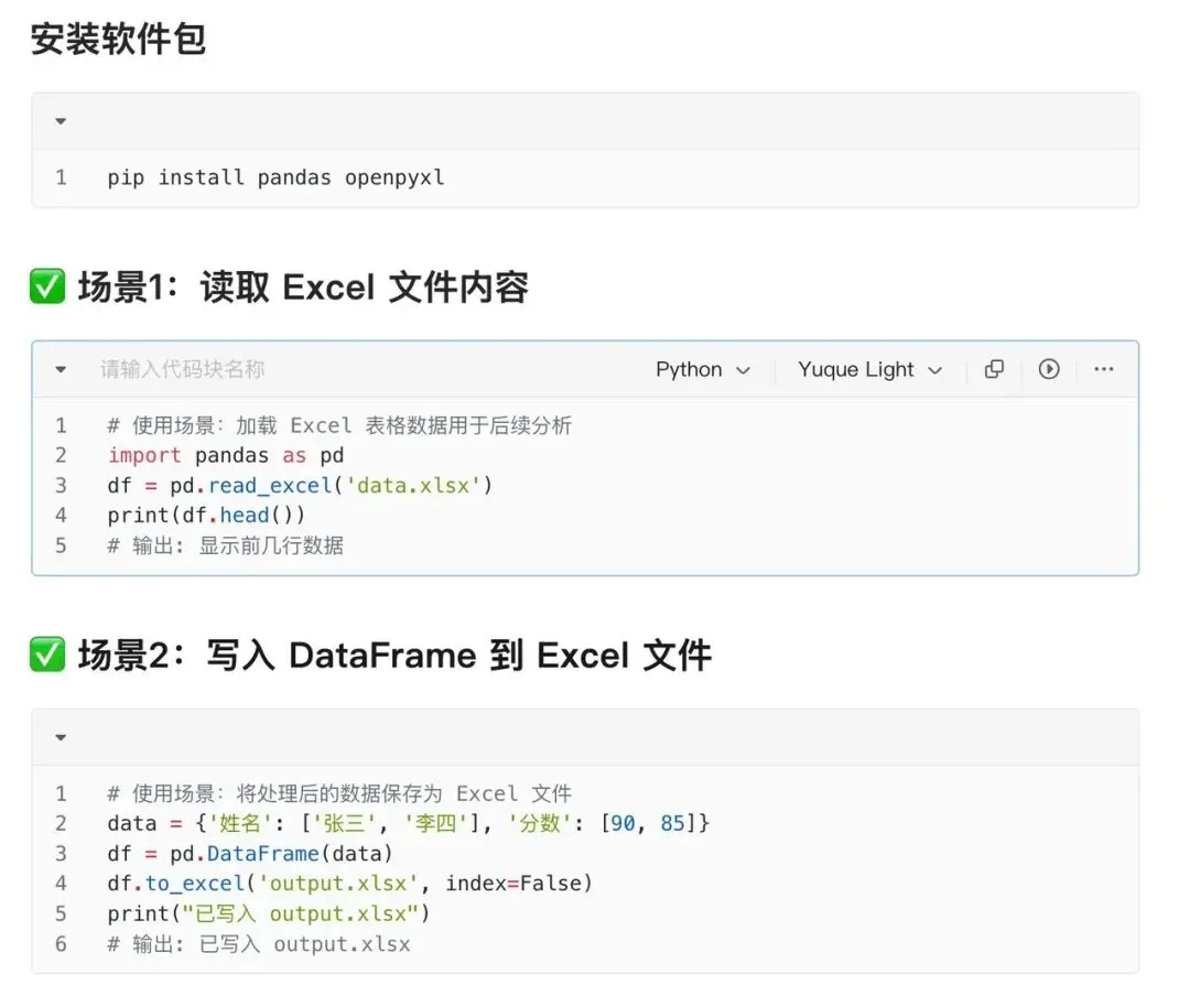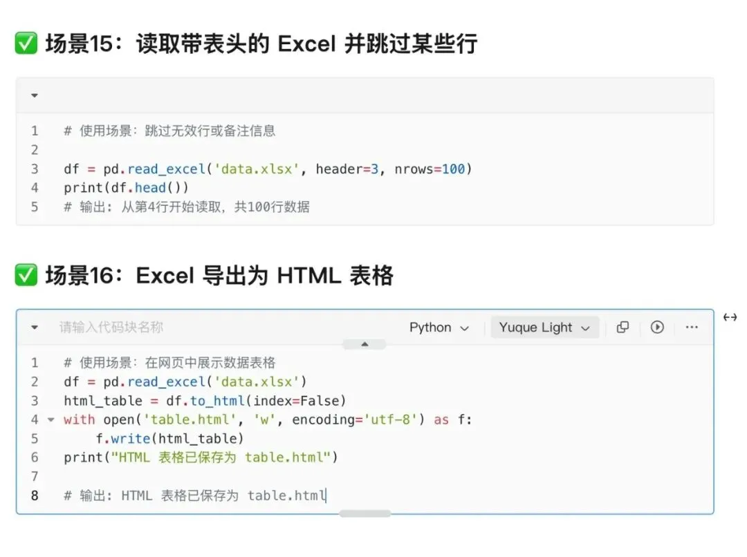 df.to_excel("output.xlsx", index=False)用途:把DataFrame格式数据保存为Excel文件,index=False表示不保存索引。老板要什么格式,就给什么格式!