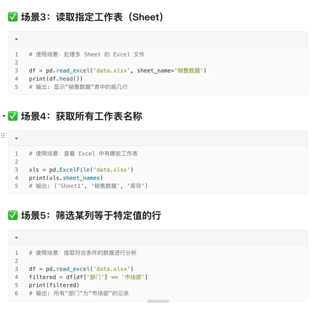import pandas as pddf = pd.read_excel("data.xlsx")print(df.head()) # 偷看前5行数据用途:一键打开Excel文件,读取数据,默认获取第一个Sheet里的数据。再也不用手动复制粘贴了!