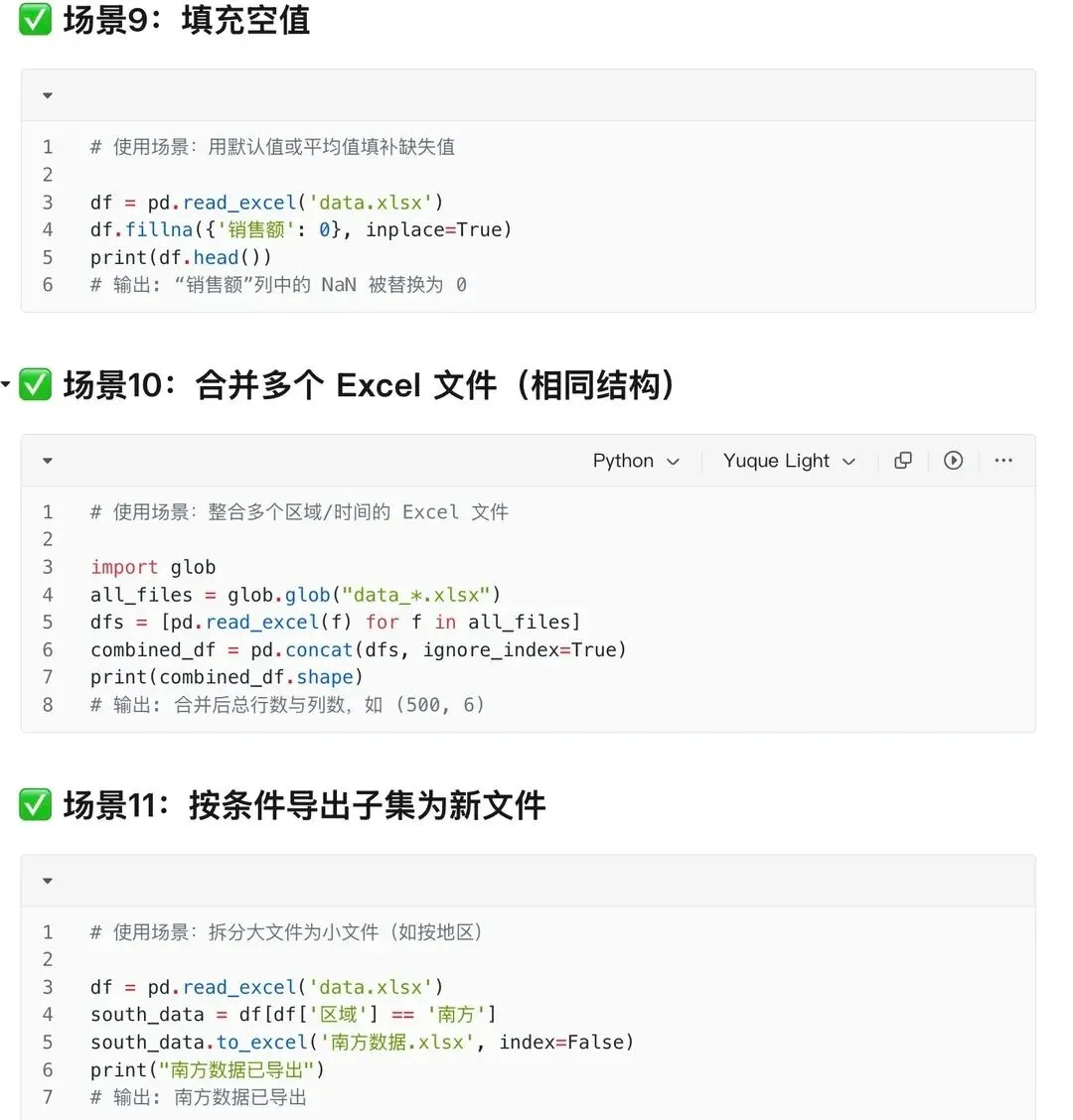 import osfiles = [f for f in os.listdir('.') if f.endswith('.xlsx')]combined_df = pd.DataFrame()for file in files: df = pd.read_excel(file) combined_df = pd.concat([combined_df, df], ignore_index=True)combined_df.to_excel('combined.xlsx', index=False)用途:批量处理多个Excel文件时,合并是非常常见的需求。文件太多?一个脚本全部合并!