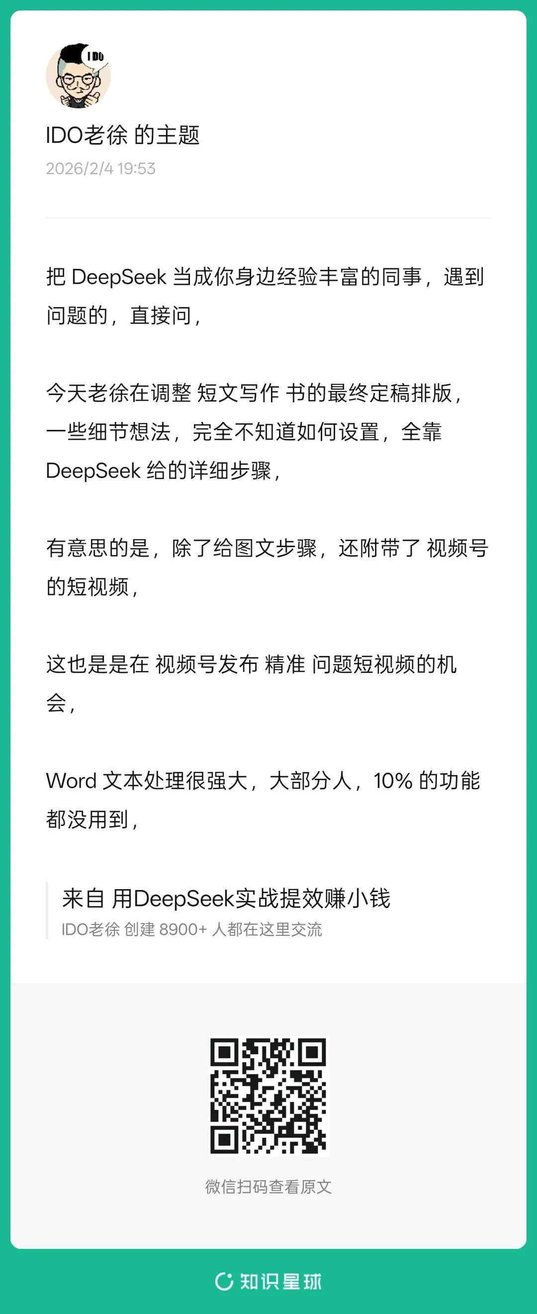 今天老徐在调整 短文写作 书的最终定稿排版,一些细节想法,完全不知道如何设置,全靠 DeepSeek 给的详细步骤(直接打字描述你的想法,得到答案)。
