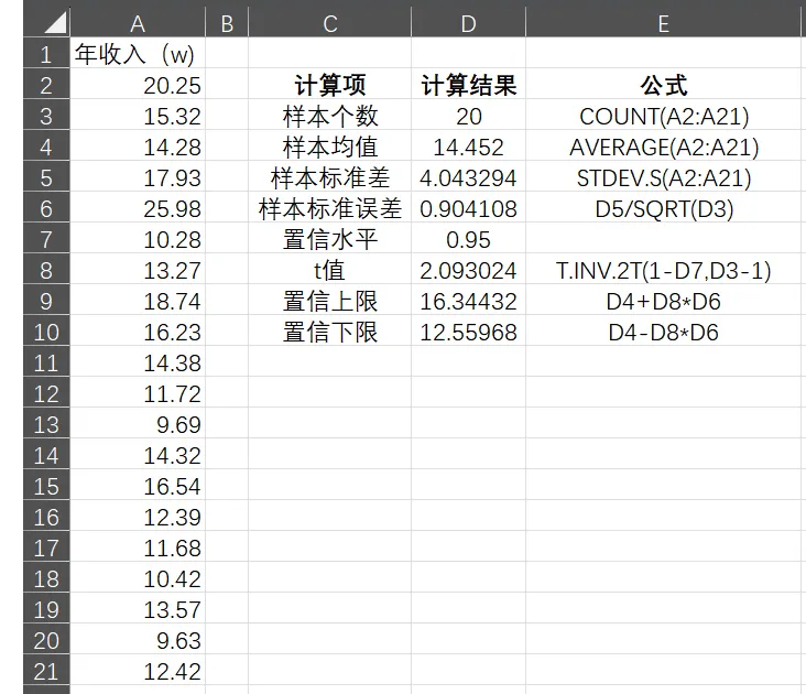 式中,是自由度为时,t分布中右侧面积为的t值,该值可用Excel中的TINV统计函数计算t分布的临界值,其语法为TINV(,df),其中表示对应于双尾t分布的概率,df表示样本的自由度。