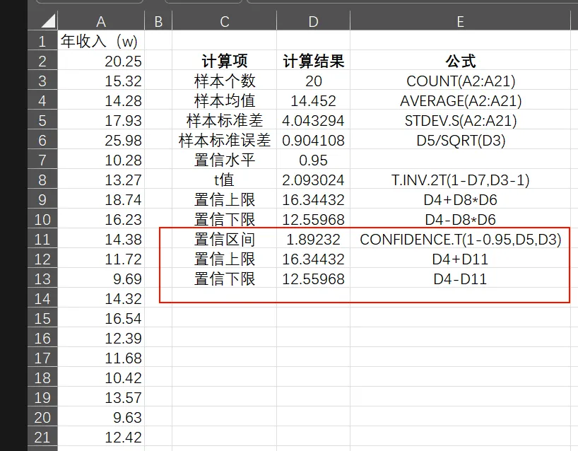 手算复杂度max,当然在新版的Excel中有个函数CONFIDENCE.T ,可以直接返回t分布总体平均值的置信区间。