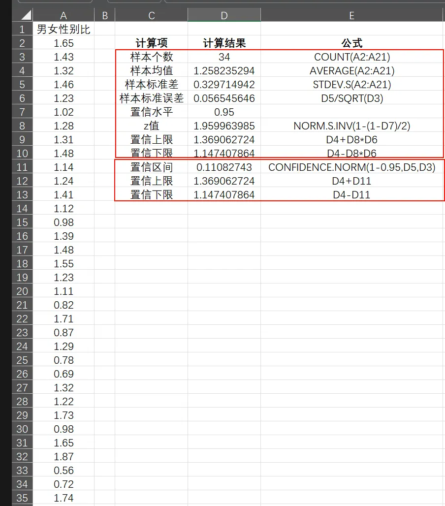仍然使用Excel进行手算(上部分)与Excel的CONFIDENCE.NORM函数进行计算(下部分)。