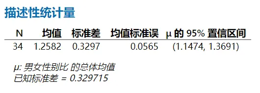 下面以某省34个地区人口的男女性别比为例创建一个数据,对其进行均值估计。34个地区人口的男女性别比的原始数据如图所示,数据中包含“男女性别比”一个变量,我们通过这34个地区男女性别比来估计该省总体男女性别比的均值。
