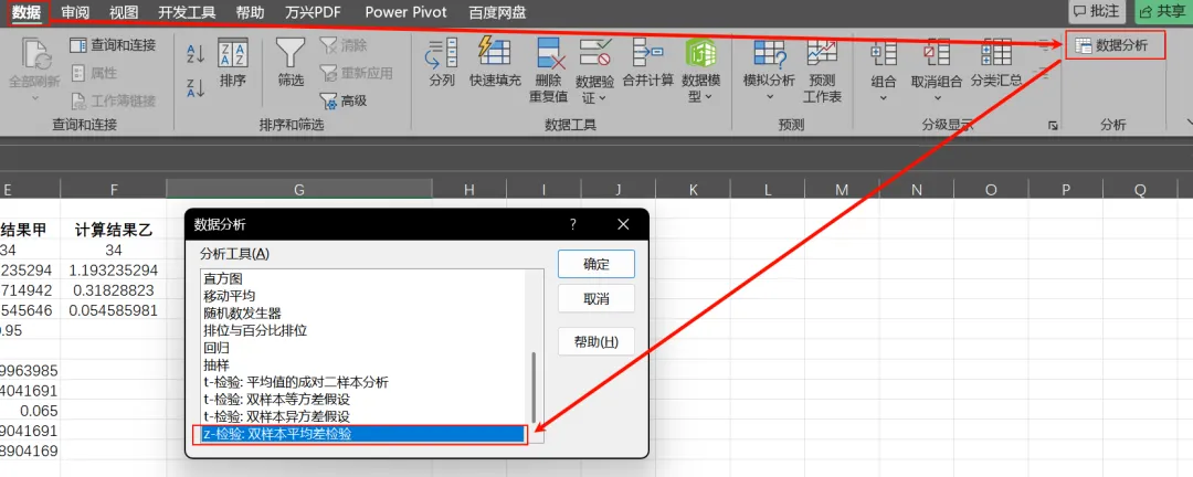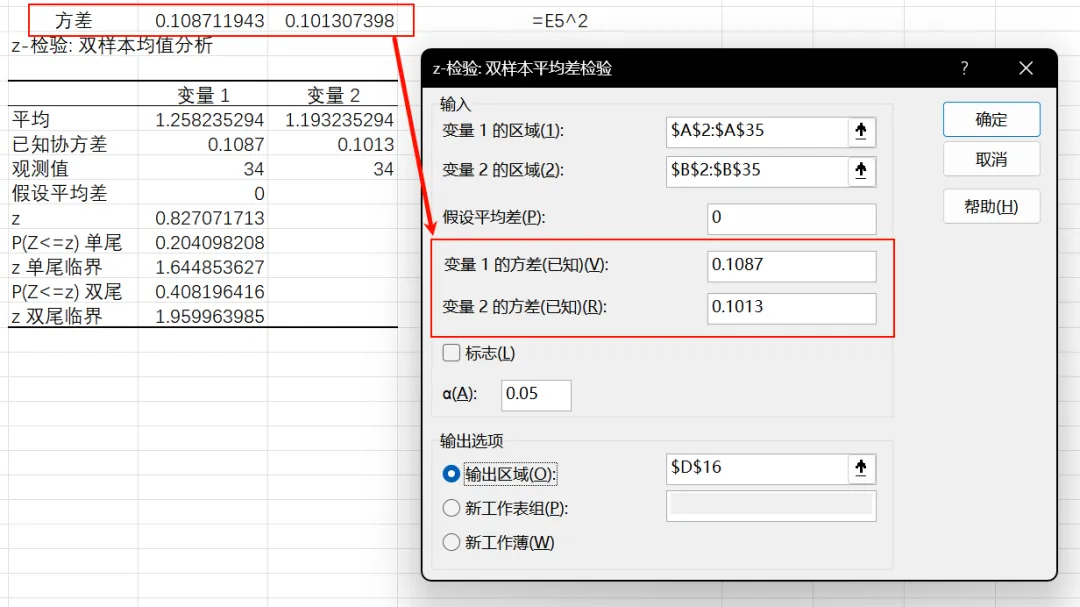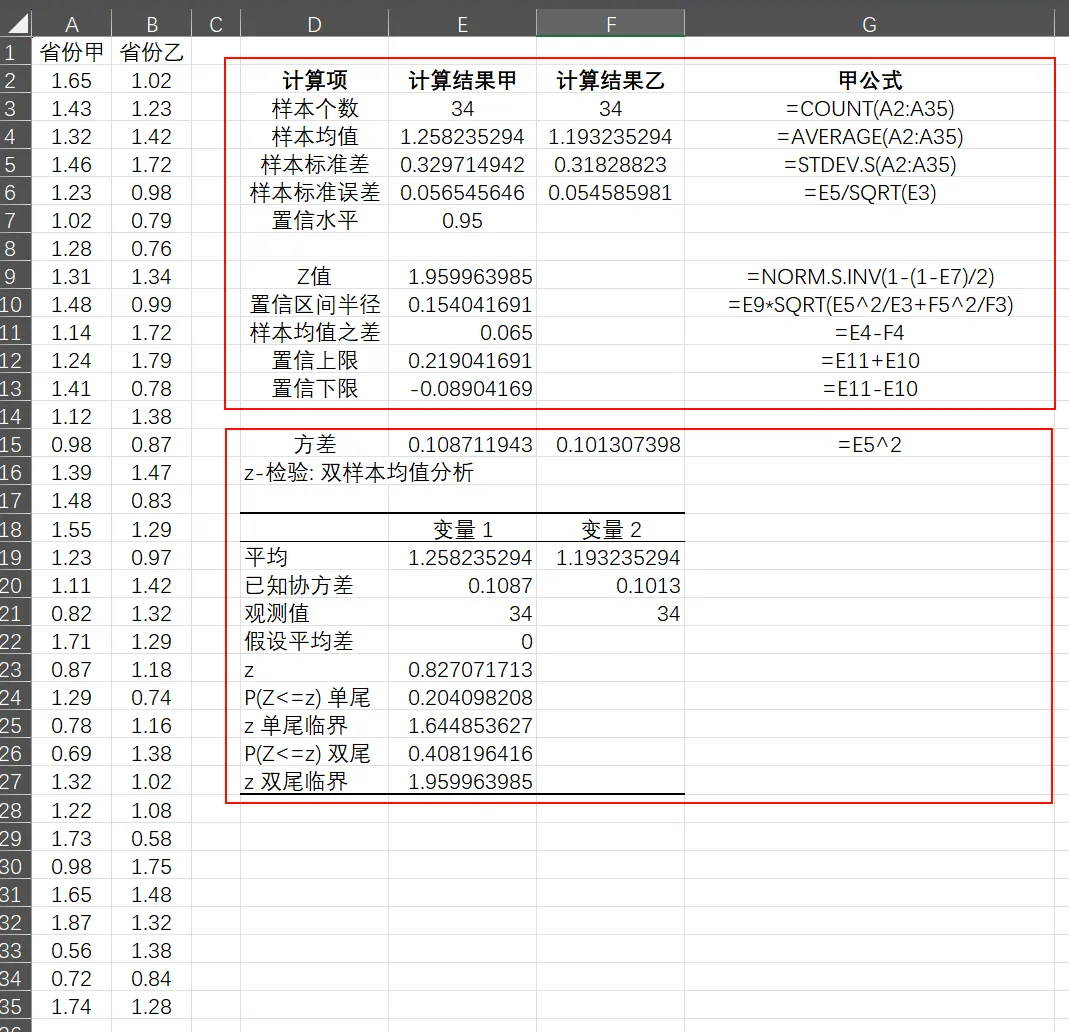 下部分是Excel自带的分析工具,但这个双样本Z检验,没有算出来置信区间(不会启用数据分析库的参考Excel中使用数据分析工具进行描述统计分析):