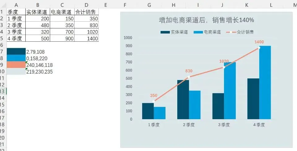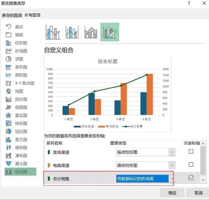 在这个案例中,值得拎出来提一下的有以下两点:1. 先选中表格中的任意一个单元格,然后先插入一个柱状图,然后右键选择更改图表类型,更改为组合图,合计销售的折线图选的是带数据标记的折线图;