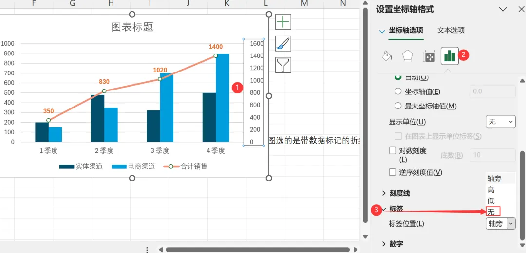 2. 因为折线图上已经有标签了,所以次坐标轴就不需要了,这里不能直接选中删除,而是需要选中后,在设置里把标签更改为无,操作如下: