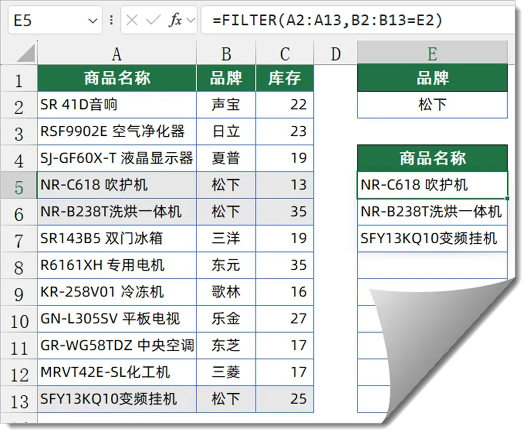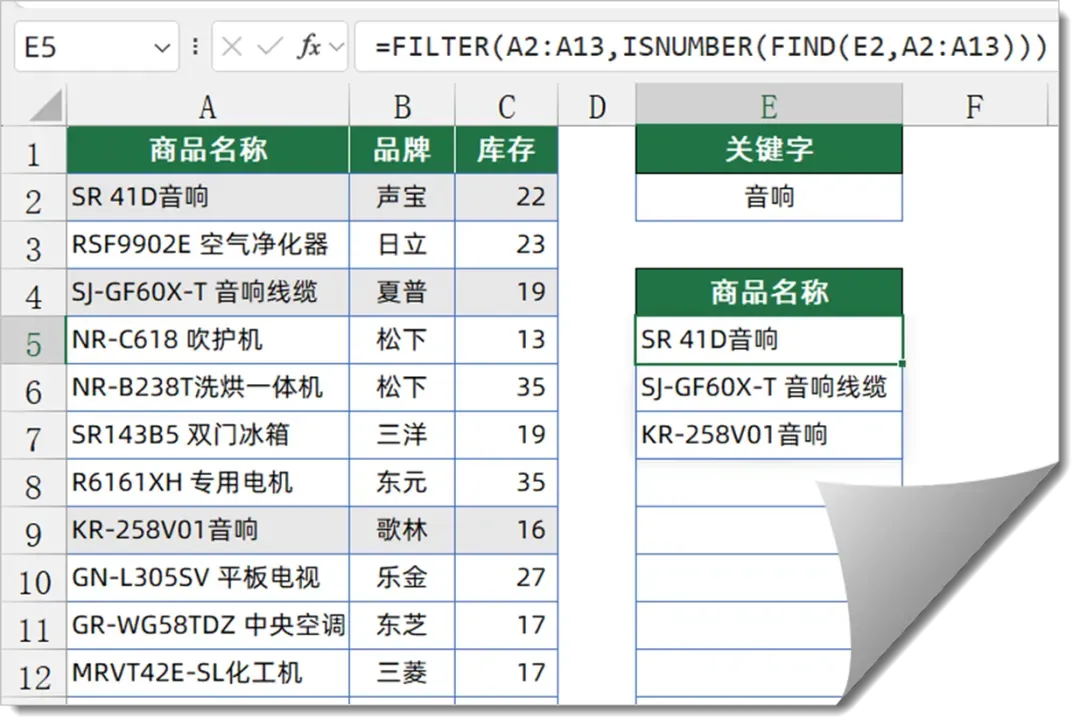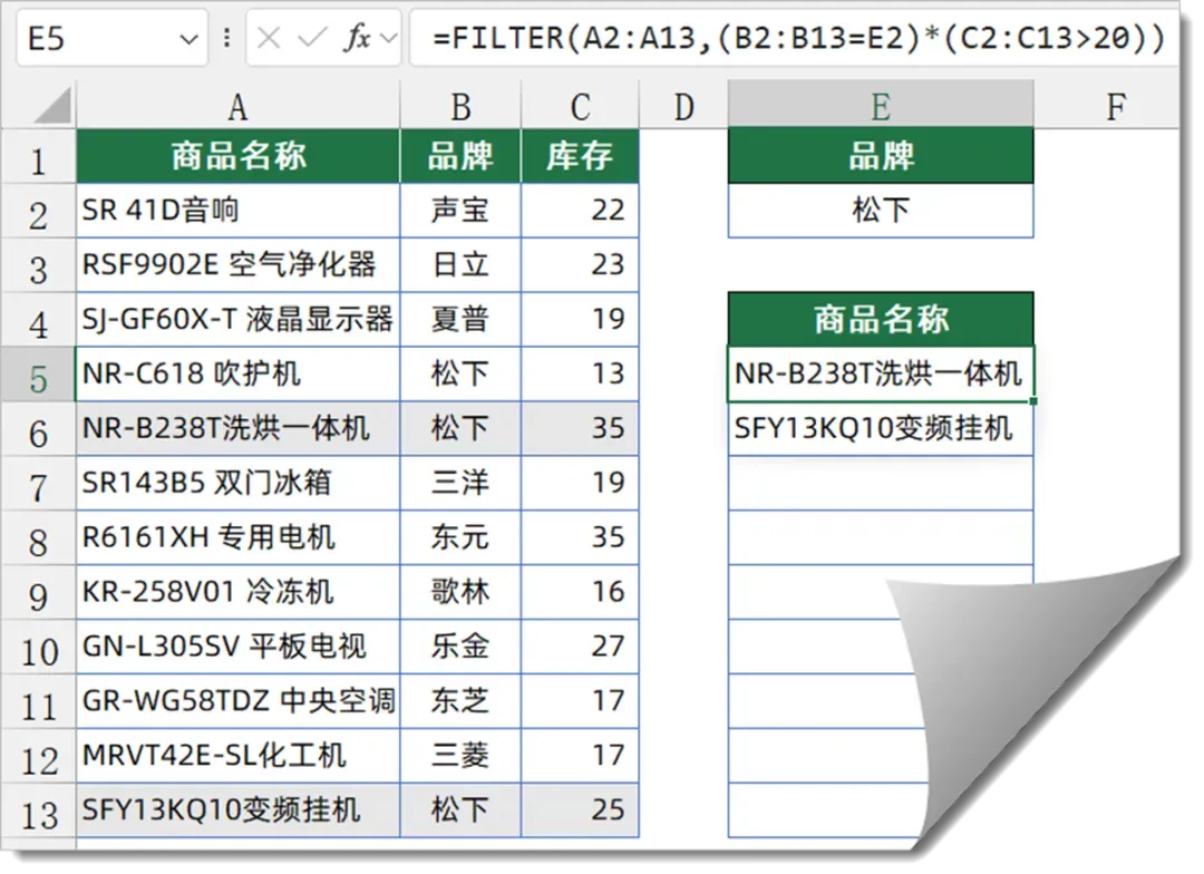 FILTER函数的作用是筛选符合条件的单元格,目前可以在Excel 2021以及最新版的WPS表格中使用。=FILTER(要返回内容的数据区域,指定的条件,[没有记录时返回的内容])如下图所示,希望根据E2单元格中指定的品牌,提取出左侧列表中该品牌的所有商品。E5单元格输入以下公式,按回车,公式结果会自动溢出到其他单元格。=FILTER(A2:A13,B2:B13=E2)公式中的A2:A13部分,是需要返回内容的单元格区域。当指定条件返回逻辑值TRUE时,FILTER函数就返回A2:A13单元格区域中与之对应的整行记录。如下图所示,希望提取出品牌为“松下”,并且库存数大于20的所有记录。=FILTER(A2:A13,(B2:B13=E2)*(C2:C13>20))本例中要返回内容的单元格区域是A2:A13,指定的条件为(B2:B13=E2)*(C2:C13>20)。(B2:B13=E2)和(C2:C13>20)分别返回一组由TRUE和FALSE构成的逻辑值的内存数组。当两组逻辑值的对应位置都是TRUE时,说明两个条件同时符合,相乘后的结果为1,否则返回0。如果相乘后的某项结果不等于0,FILTER函数就返回A2:A13单元格区域中对应位置的整行记录。如下图所示,希望提取包含关键字“音响”的所有商品名。=FILTER(A2:A13,ISNUMBER(FIND(E2,A2:A13)))本例中指定的条件为ISNUMBER(FIND(E2,A2:A13))。先使用FIND函数,获取E2单元格中的关键字在A2:A13每个单元格所处的位置。如果某个单元格里包含E2中的内容,FIND函数返回表示位置的数字,否则返回错误值。最终得到一组由数字和错误值构成的内存数组。然后再使用ISNUMBER函数,判断FIND函数的结果是不是数字。如果某个单元格中包含了E2中的关键字,ISNUMBER函数返回逻辑值TRUE,否则返回FALSE。最终FILTER函数返回A2:A13单元格区域中与TRUE对应的整行记录。如下图所示,希望根据A列的商品列表和C列的已售商品列表,提取全部未售出的商品。=FILTER(A2:A13,COUNTIF(C2:C5,A2:A13)=0)本例中指定的条件为COUNTIF(C2:C5,A2:A13)=0