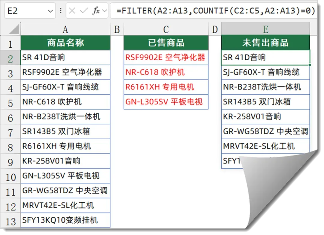 先使用COUNTIF函数统计A2:A13单元格中的每个元素在C2:C5中出现的次数,得到一组由1和0构成的内存数组。结果为1的,表示在C2:C5中出现过(已售出)。结果为0的,则表示A列的姓名在C2:C5中没有出现过(未售出)。接下来判断内存数组中的各个元素是否等于0,返回由TRUE或FALSE构成的内存数组。FILTER函数最终返回A2:A13单元格区域中与TRUE对应的整行记录。更多函数公式神技,尽在《Excel函数与公式应用大全》↓