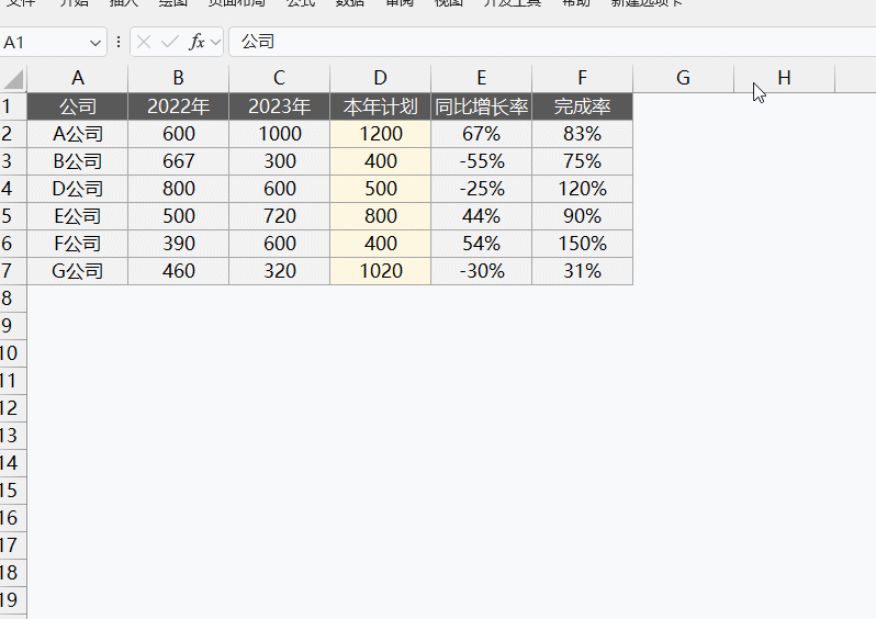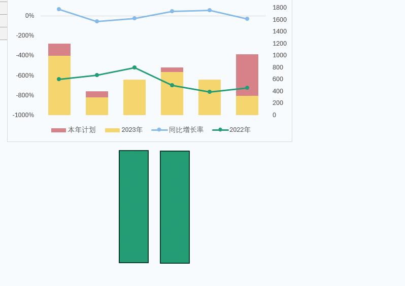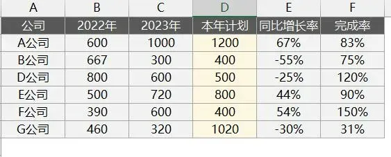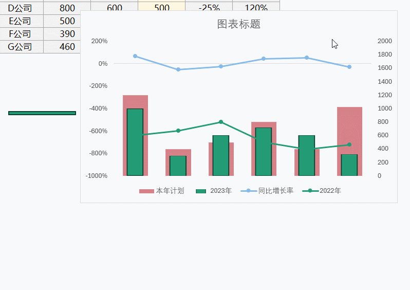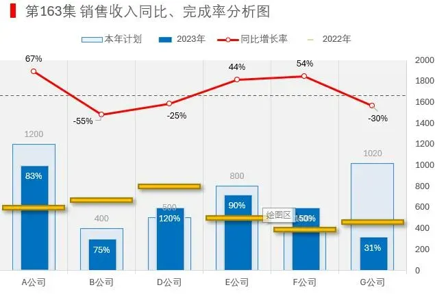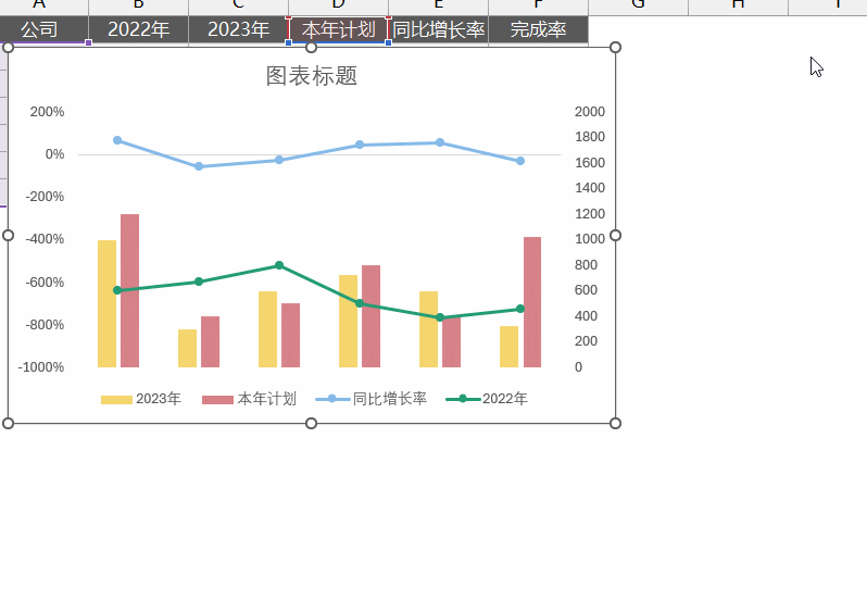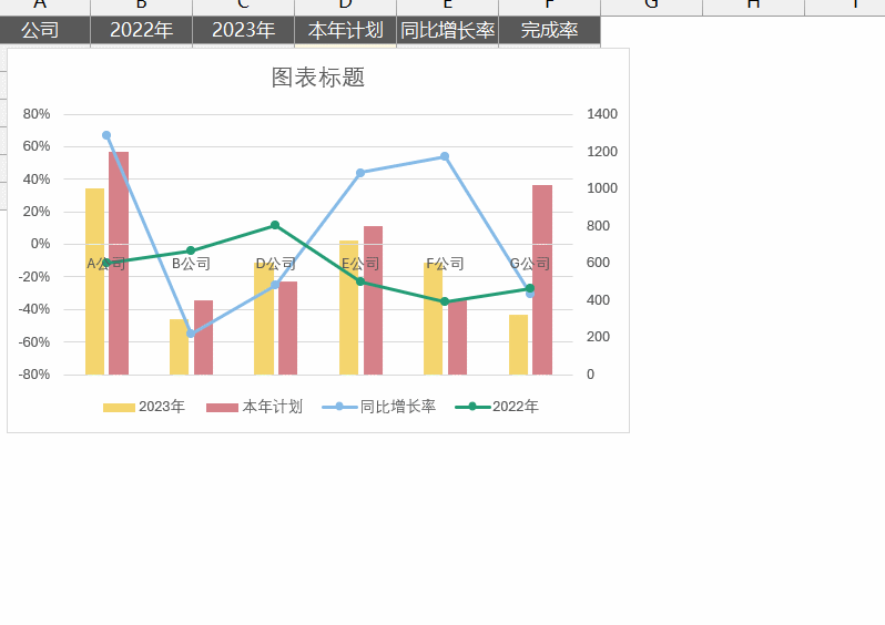 有同学提问,如何在一个图表上同时显示同比增长和计划完成情况。如下面表格如何做成图表。