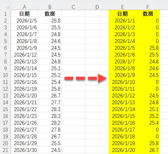 VIP学员的问题,左边只记录有数据的日期,现在想实现所有日期都体现出来,没有数据的就显示0,最终如右边的效果。