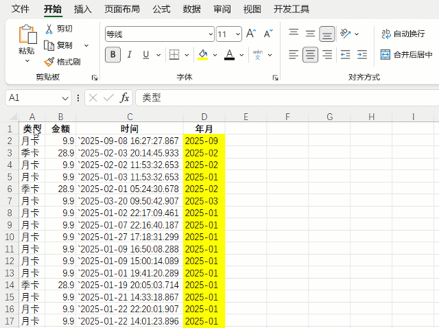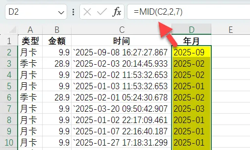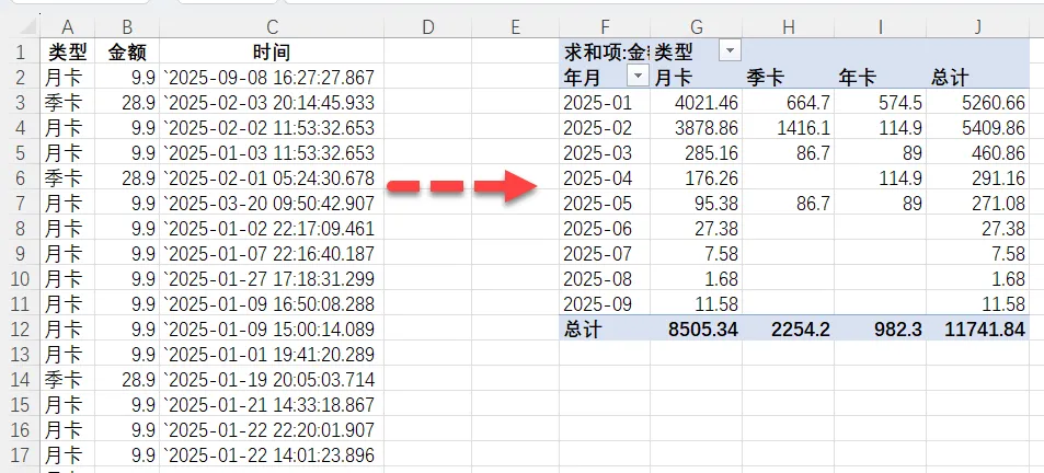 回到最开始的文本型时间,没有事先手写年月、类型,遇到这种就可以直接用透视表统计。