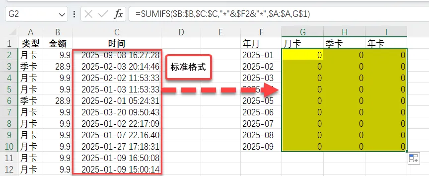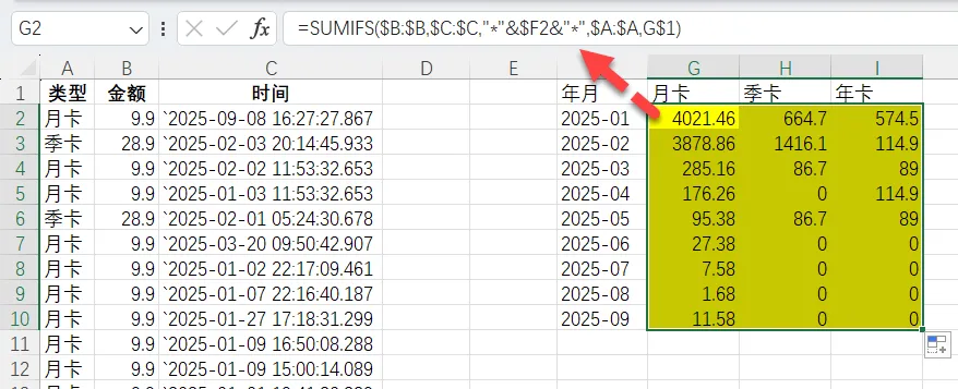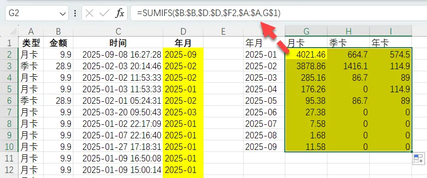 假如原来年月、类型已经手工写好,这种也可以用SUMIFS函数。时间这里是文本,可以用通配符*表示包含年月。