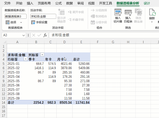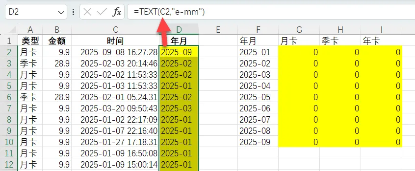 不过统计之前,同样可以先用辅助列将年月提取出来,这样方便处理。