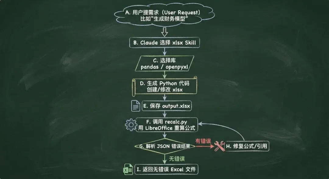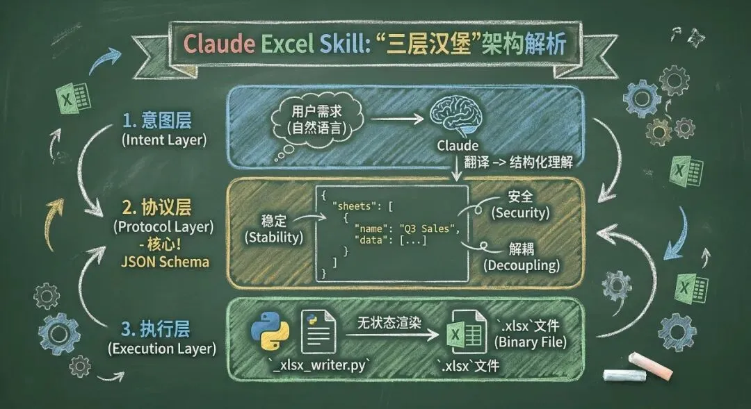 Claude 的 Skills(技能)机制让 AI 能够像“安装插件”一样动态获得新能力。但一个生产环境可用的 Skill,绝不仅仅是几句 Prompt 那么简单。最近,我们深入扒了 Claude 官方开源的 Excel Skill (xlsx)源码。这个 Skill 极其强悍,它能让 Claude 稳定、精准地生成复杂的 Excel 表格,而不会出现幻觉或格式错误。今天,我们就像做手术一样,从代码实现到架构设计全方位拆解它。看完这篇,你也能写出架构优雅、稳定性爆棚的 Agent 技能。一、顶层设计『Skill 的“三驾马车”』