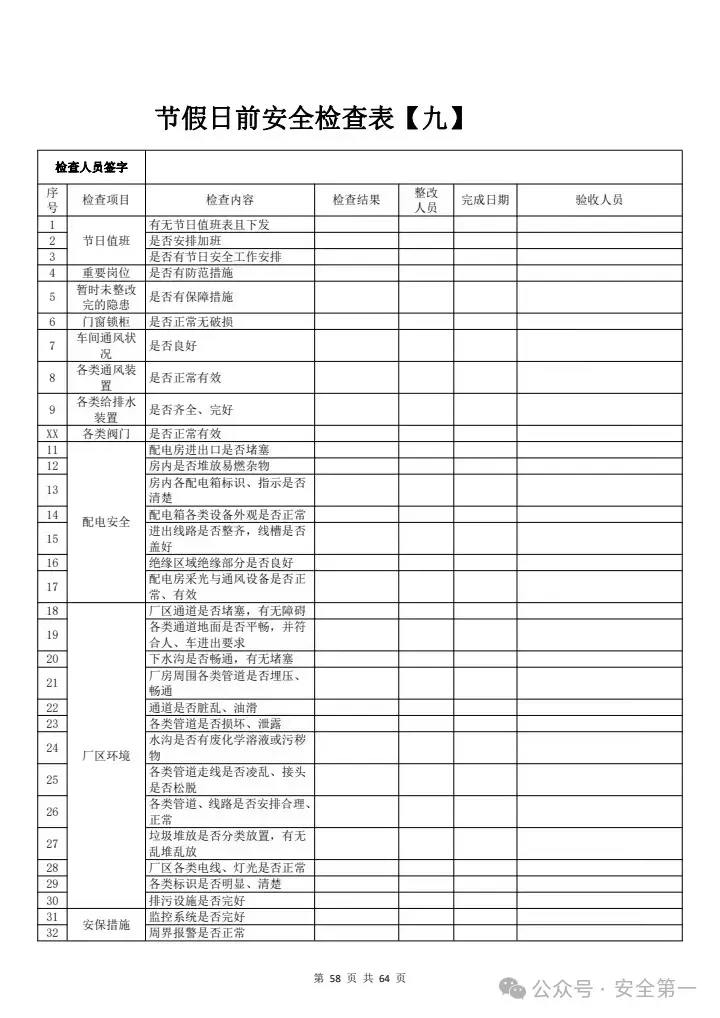 节假日前安全检查表九