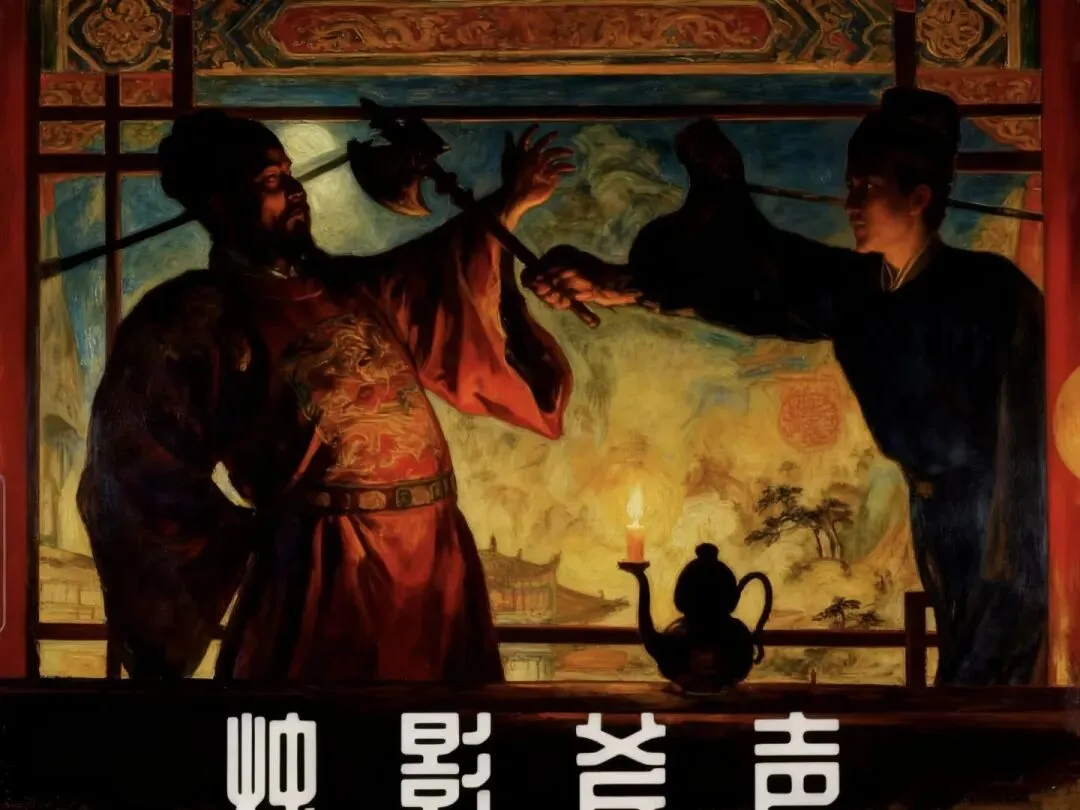 烛影斧声。 侍从遥见烛影下人影晃动,并听见斧头戳地声与太祖的高喊。