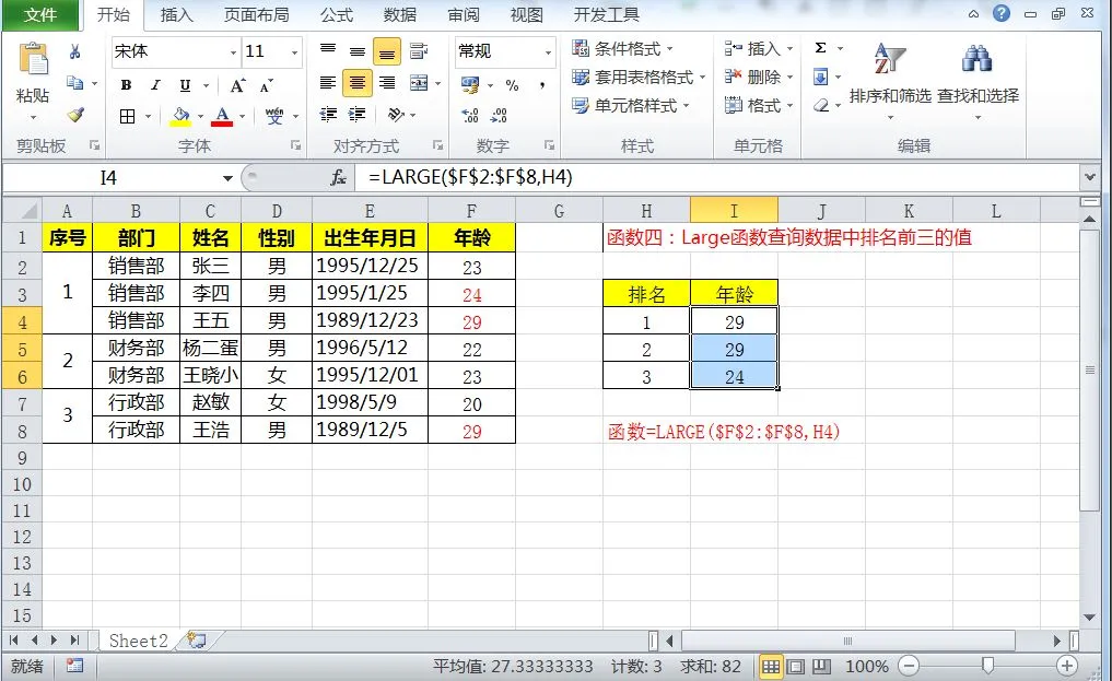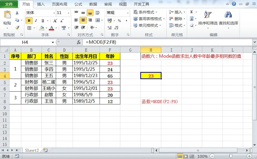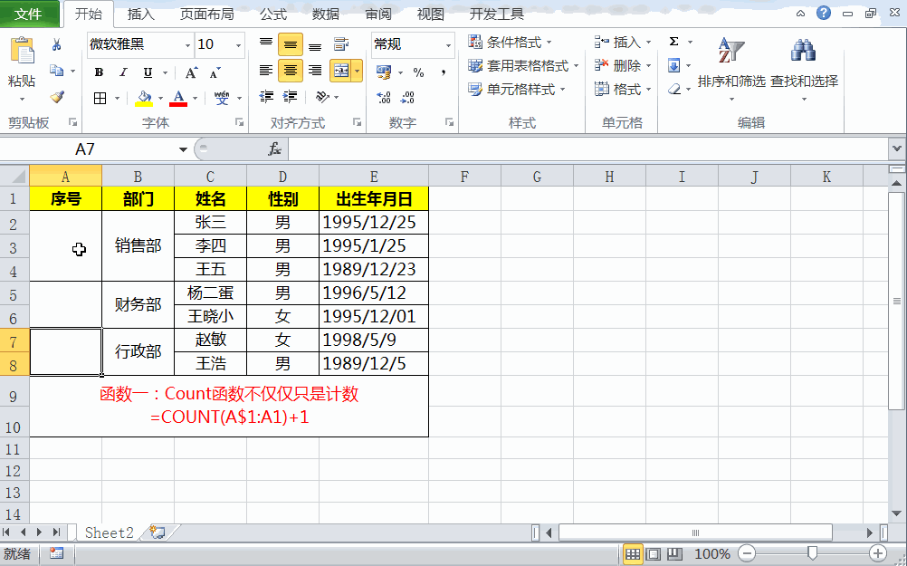 我们以一份包含7名员工信息的表格为例,数据涵盖部门、姓名、性别、出生日期和年龄等字段。下面逐一介绍各函数的具体应用。