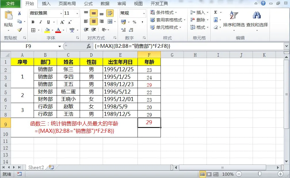 逻辑判断(B2:B8="销售部")返回TRUE/FALSE数组,与年龄数组相乘后,MAX只计算满足条件的数据