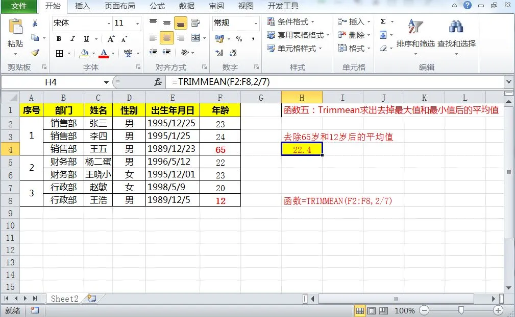 应用场景:数据中存在异常年龄(65岁和12岁)时,计算有代表性的平均值。